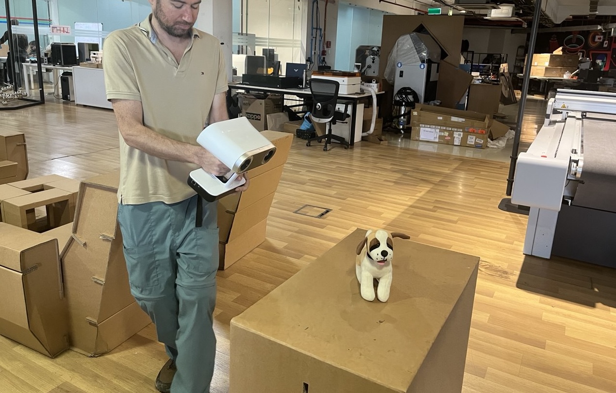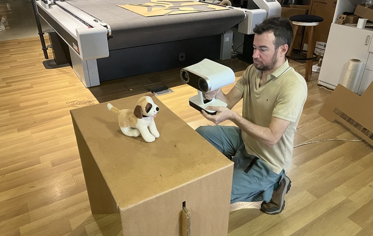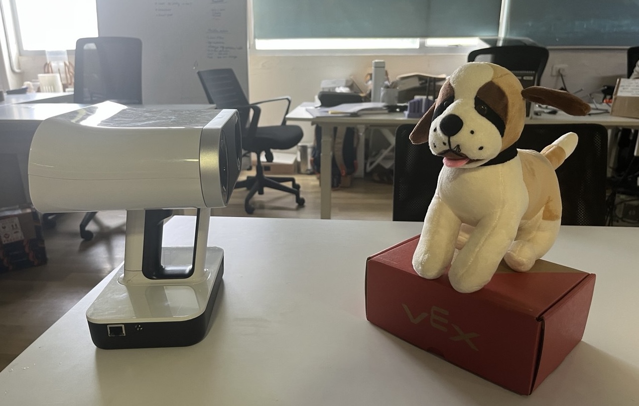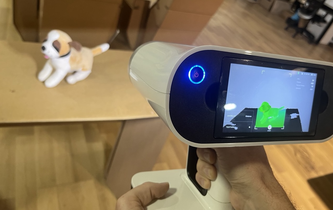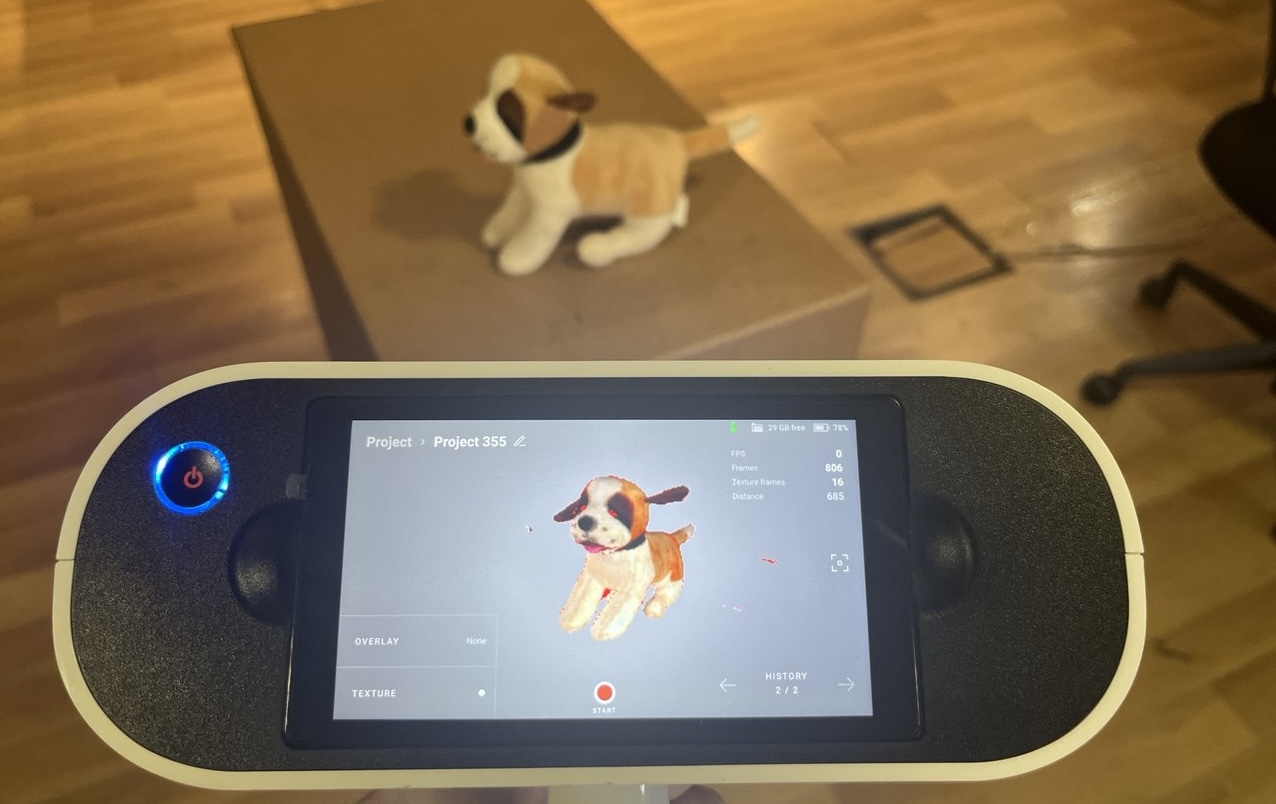 for larger objects, so our dog would be on the small side. Here is the scanner and the plush dog we will scan: