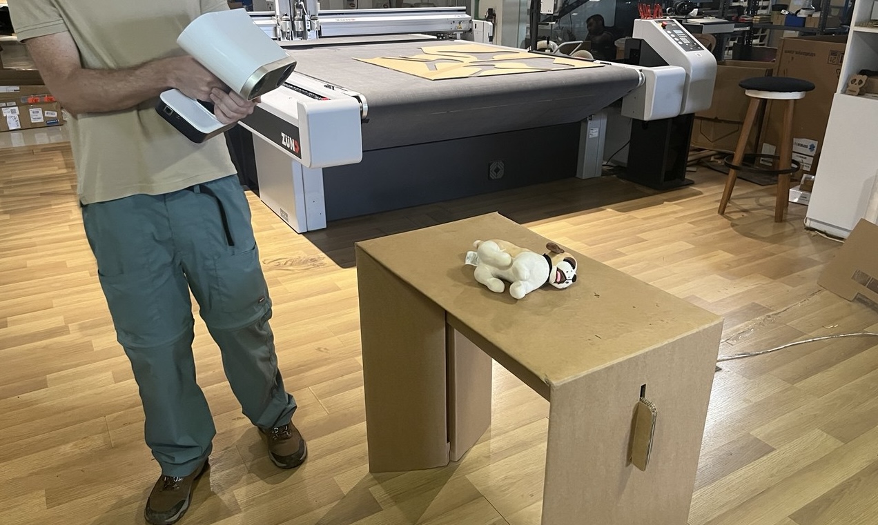 Shown in this picture is the setup, with the dog in the center of a plain cardboard table. Of course we'll want minimal other objects or items to distract the scanner from the object we'd like to capture.