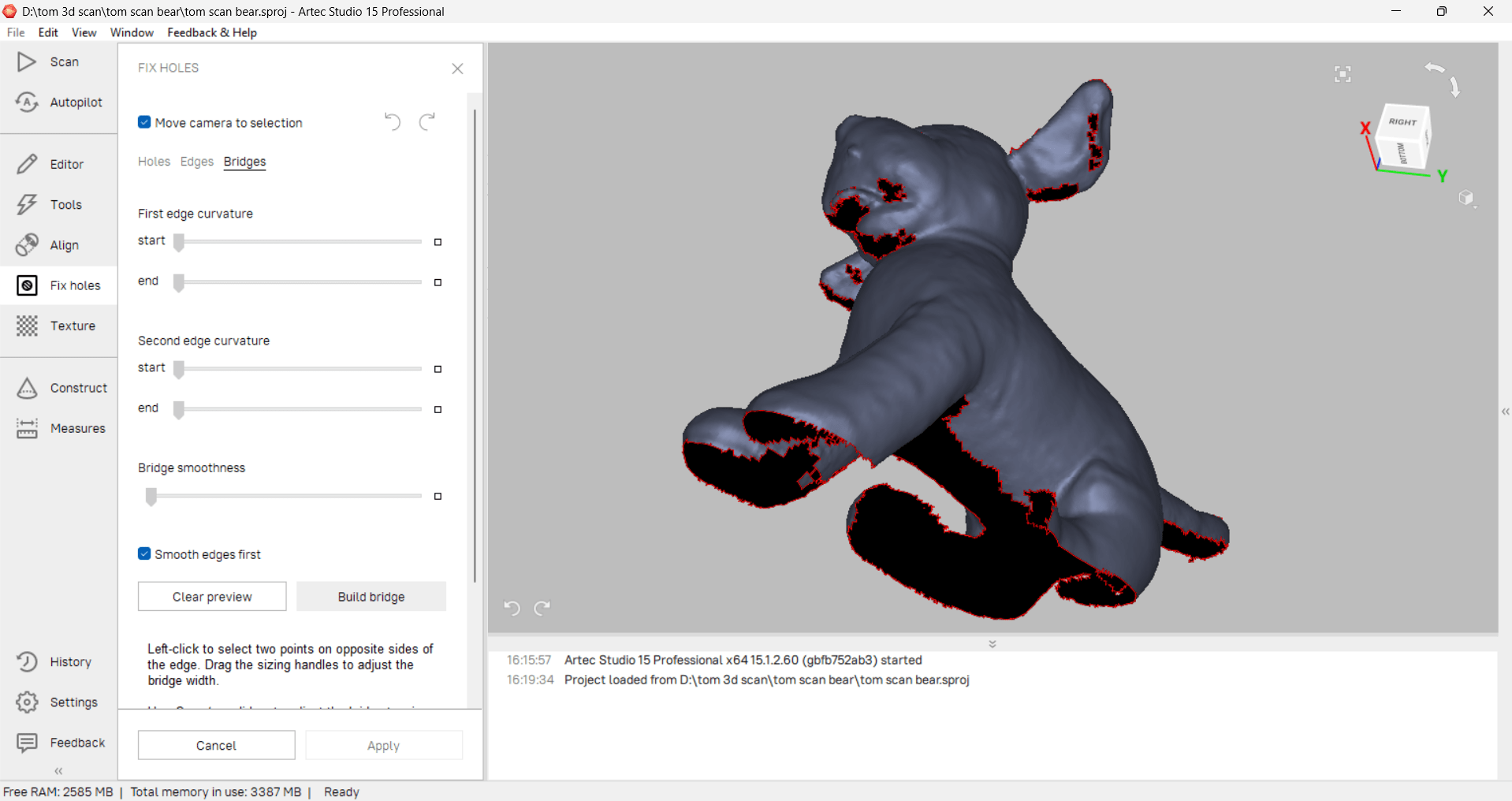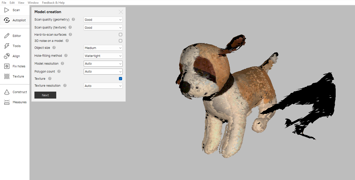 Now that we took the 3D scan, we can process the results using the Artec Studio software. There is a mode called autopilot which guides the new user through the process. Anyway, here is what the output looks like initially. It is actually in 2 parts, and has picked up some extra data as seen in black. Ideally we will have just one scan, but we can also work with this data as it is.