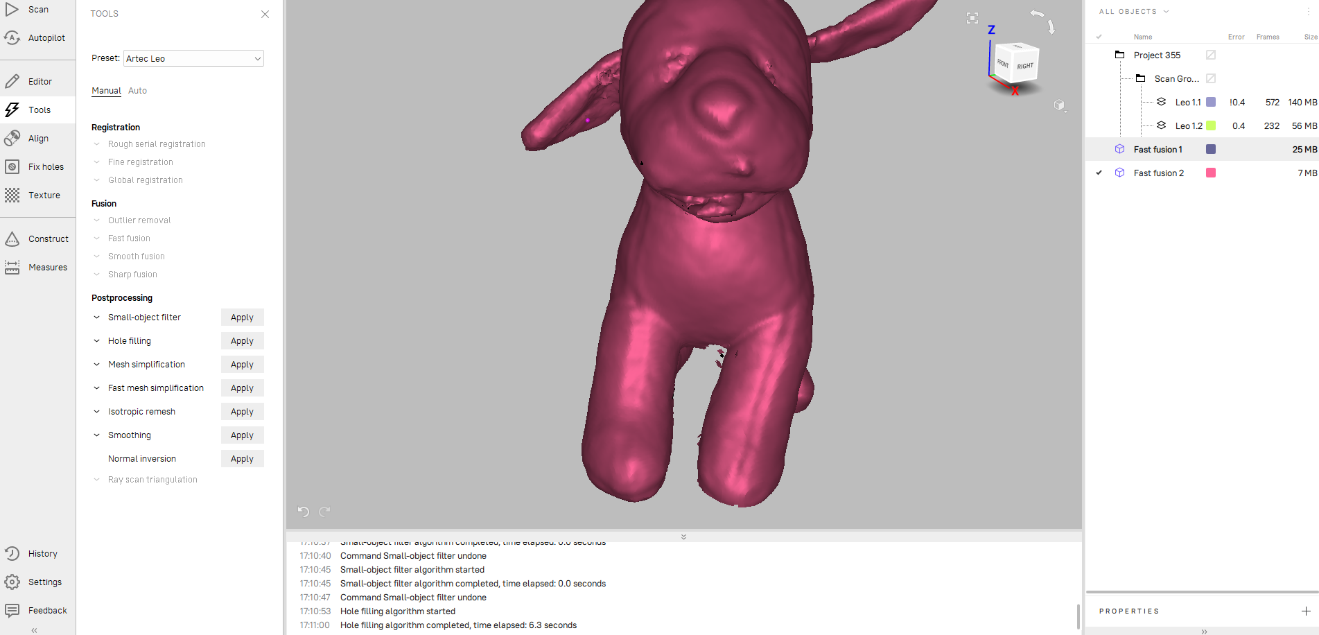 Initially we apply a "fast fusion" to generate the 3D model. The model is separate from the texture which is fitted on top of the model.
