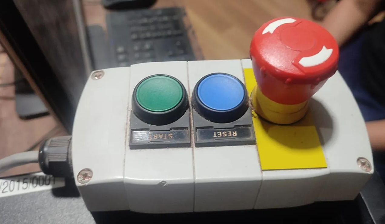 Safety! To the left of the computer are some big buttons for start, restart, and an emergency stop button.
