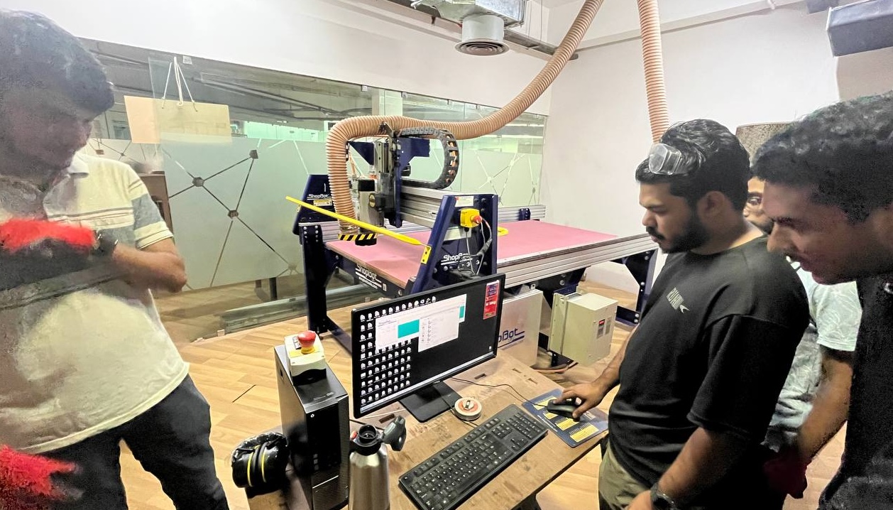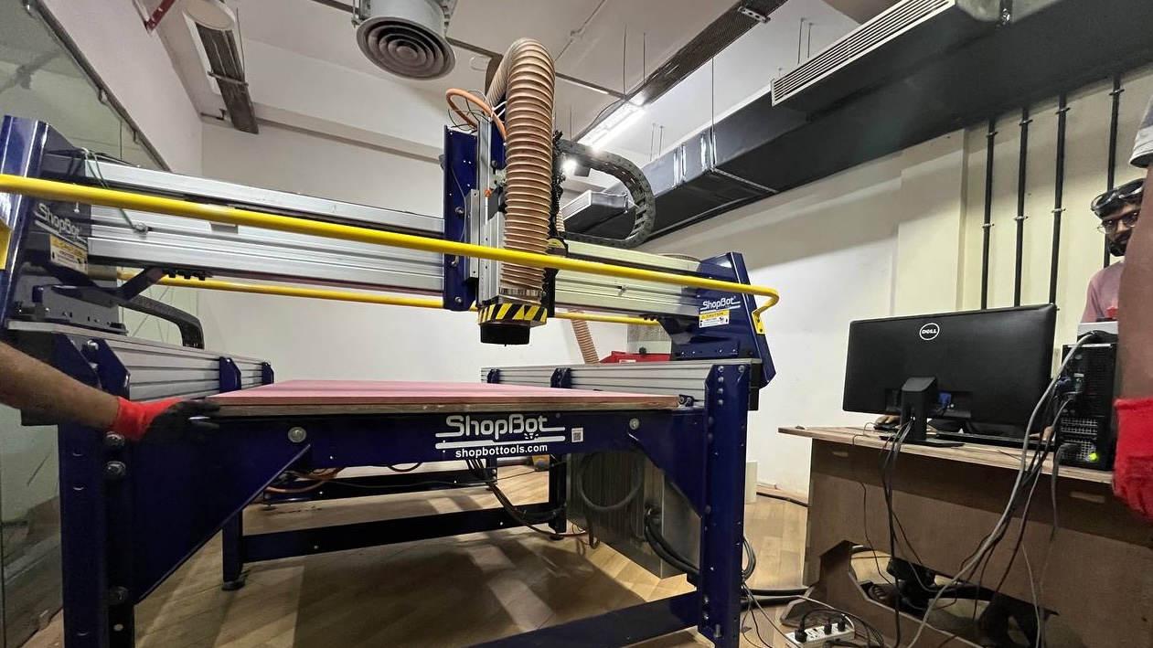 Once we had adorned our PPE, we entered the room where is the CNC. Here is the large machine (with computer). It's called a Shop Bot.