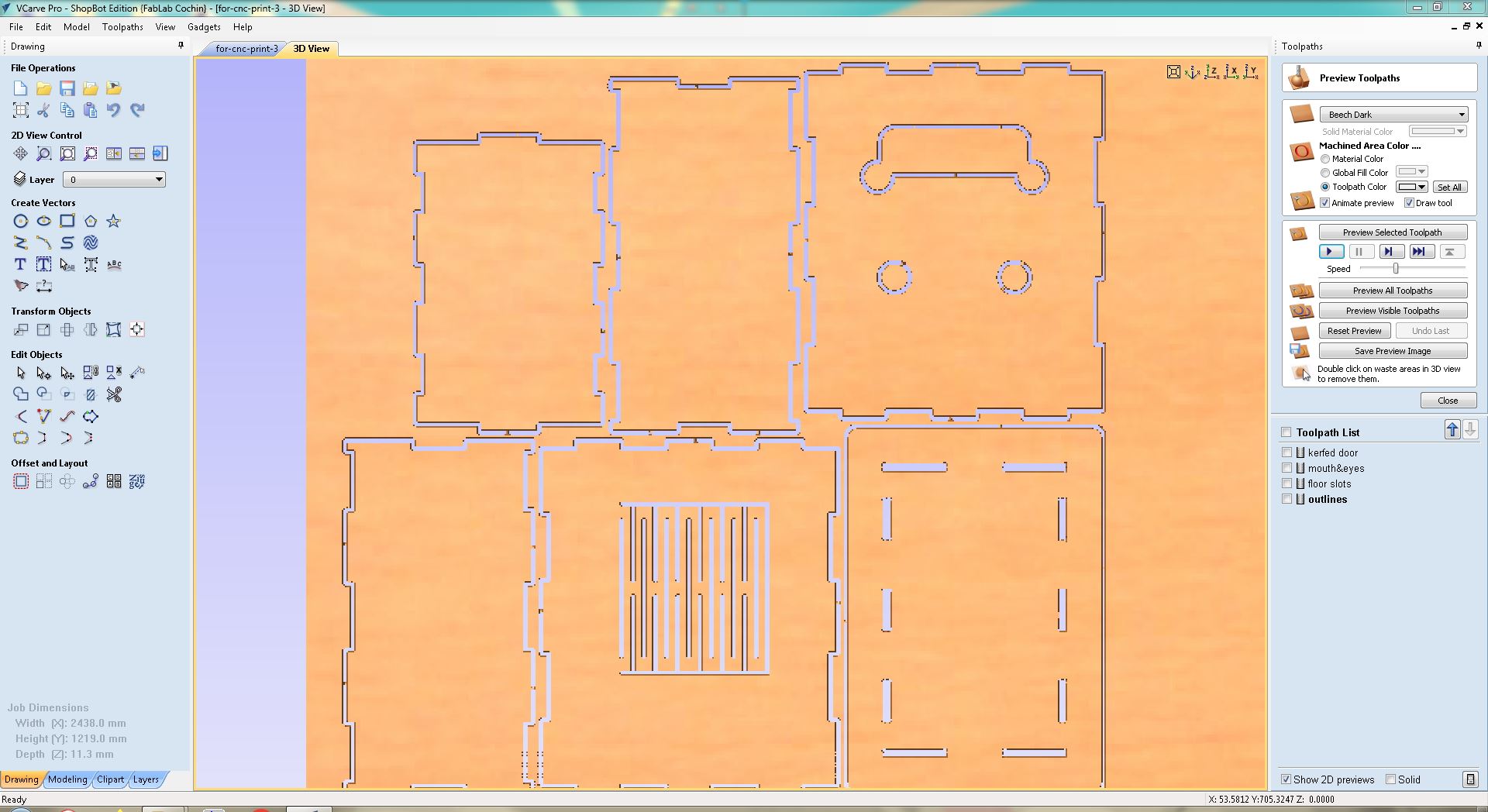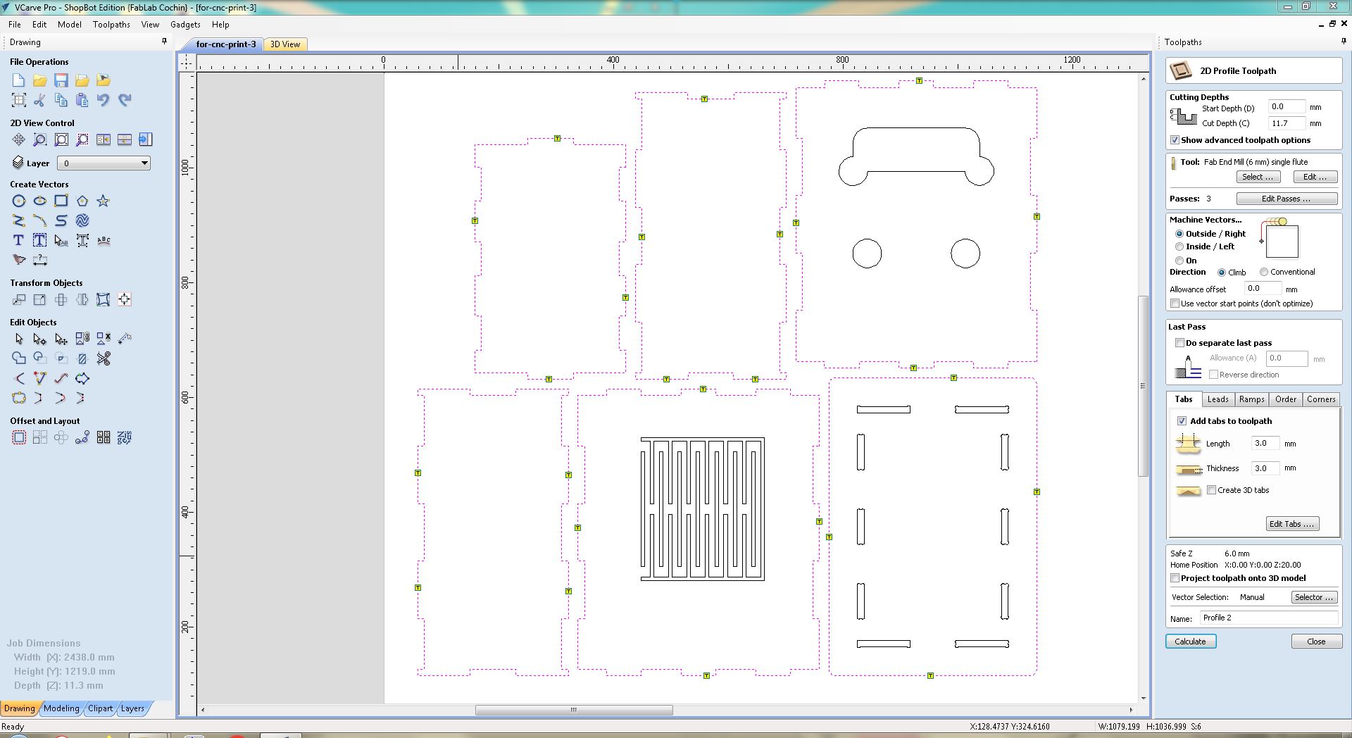 Then here is the final toolpath for the outline of the main pieces. Here we need to use tabs, which are small sections which are not cut by the tool, so that we have stability to allow proper cutting! We must select where to place tabs, and just 4-5 tabs for even a large piece are enough.