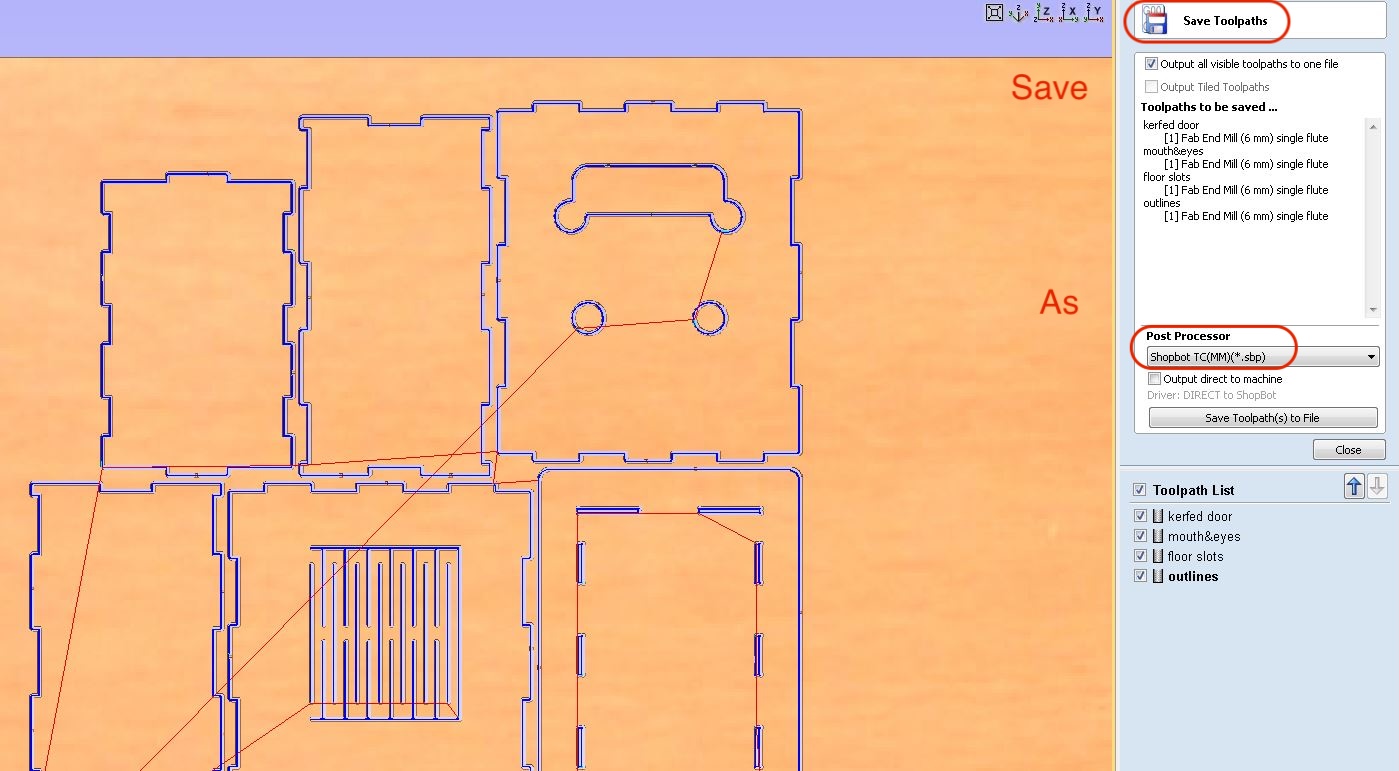 Finally we can save the toolpaths, it will be saved as filetype .sbp which is akin to G-Code for the Shop Bot.