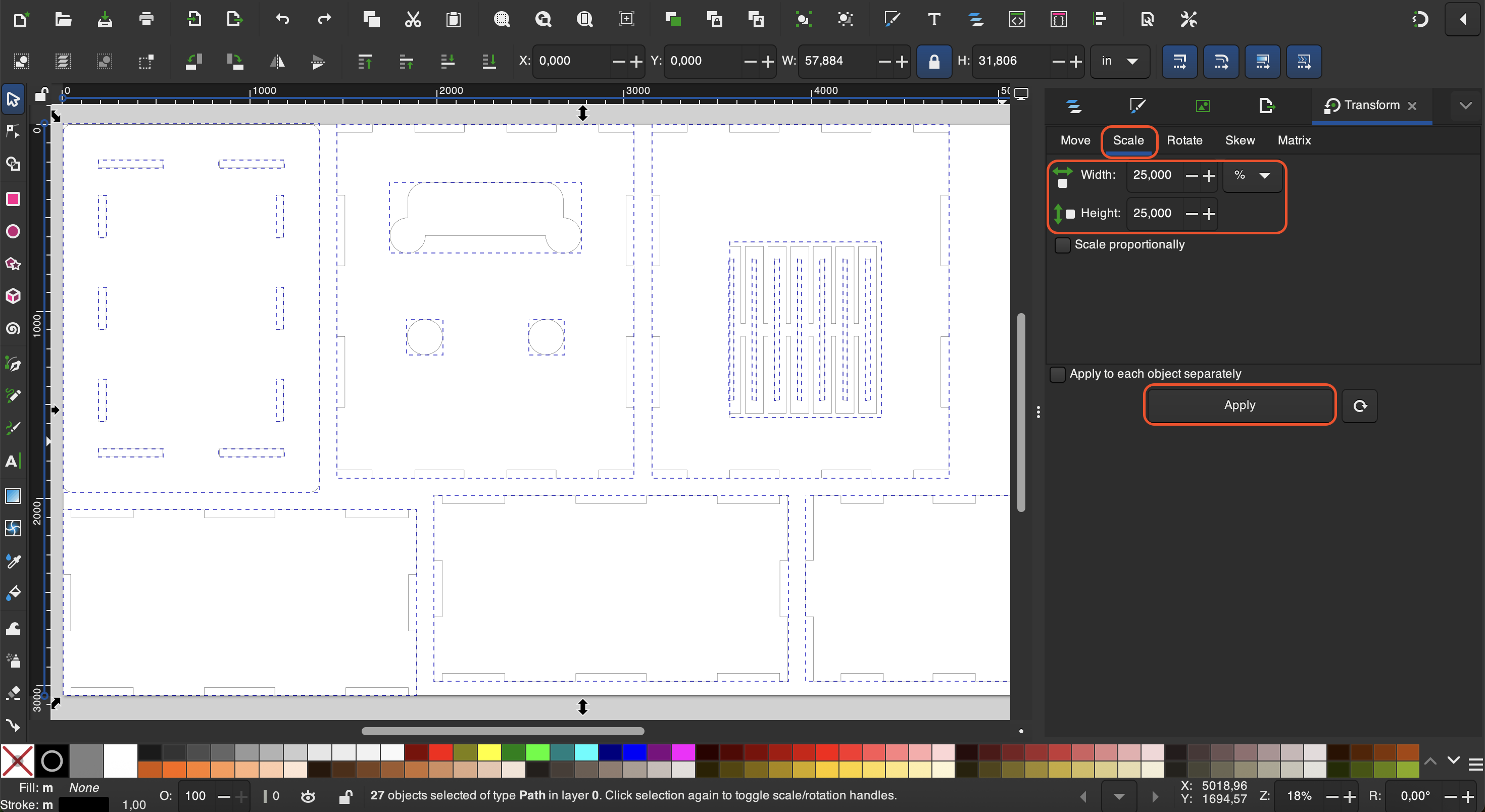 Before producing in large scale, we will cut with the laser cutter; in case of issues, we just lose a short time and a bit of cardboard. Now obviously when we cut with cardboard, we'll be cutting a scaled-down smaller version. We already know that the width of the board we will use on the CNC is about 11.3 mm, and we also measured the cardboard to be 2.85 mm, hence a ratio of 2.85/11.3 is conveniently 25%. In Inkscape we navigate to "Object"->"Transform" to scale it.