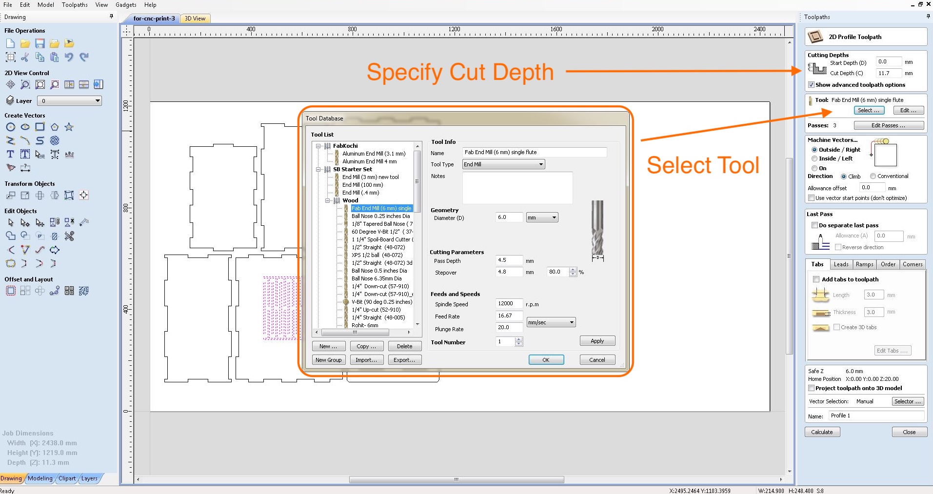 Then we'll go through each part of the job, specifying certain parameters like cut depth and tool, though these particular parameters tend to stay constant.