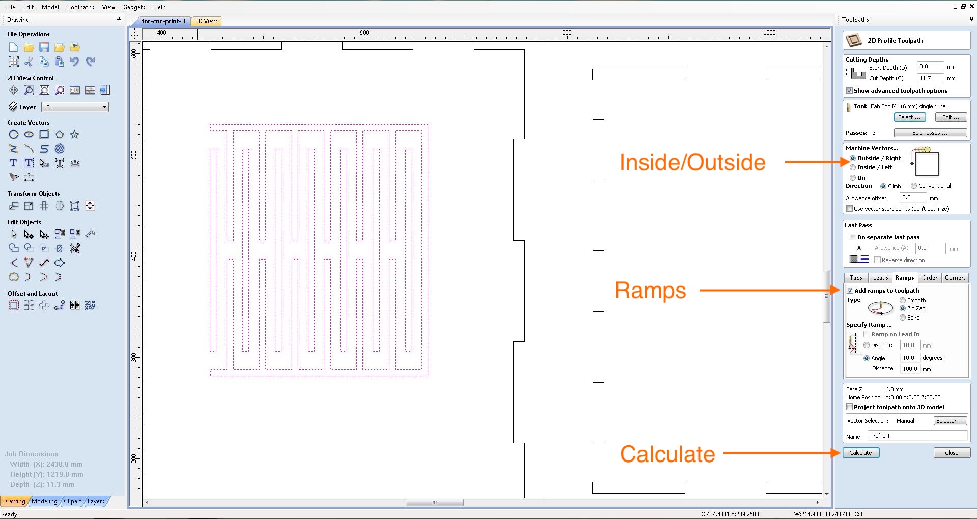 Some other important parameters are there, such as position of the drill bit inside or outside of the line and ramps. Here we have selected outside but it actually will need to be inside. The ramps are also important, as it is both difficult and dangerous for the bit to dig straight into so much material. Finally when this is done we can click on 'calculate', which will simply calculate the toolpath.