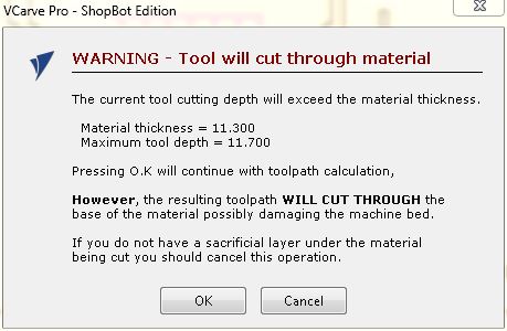 Here we get a warning because the cutting depth is greater than the material thickness, however this was actually intentional to make a clean cut completely through the wood. In fact we have the sacrificial layer underneath and we'll just be cutting into that a little bit (0.4 mm).