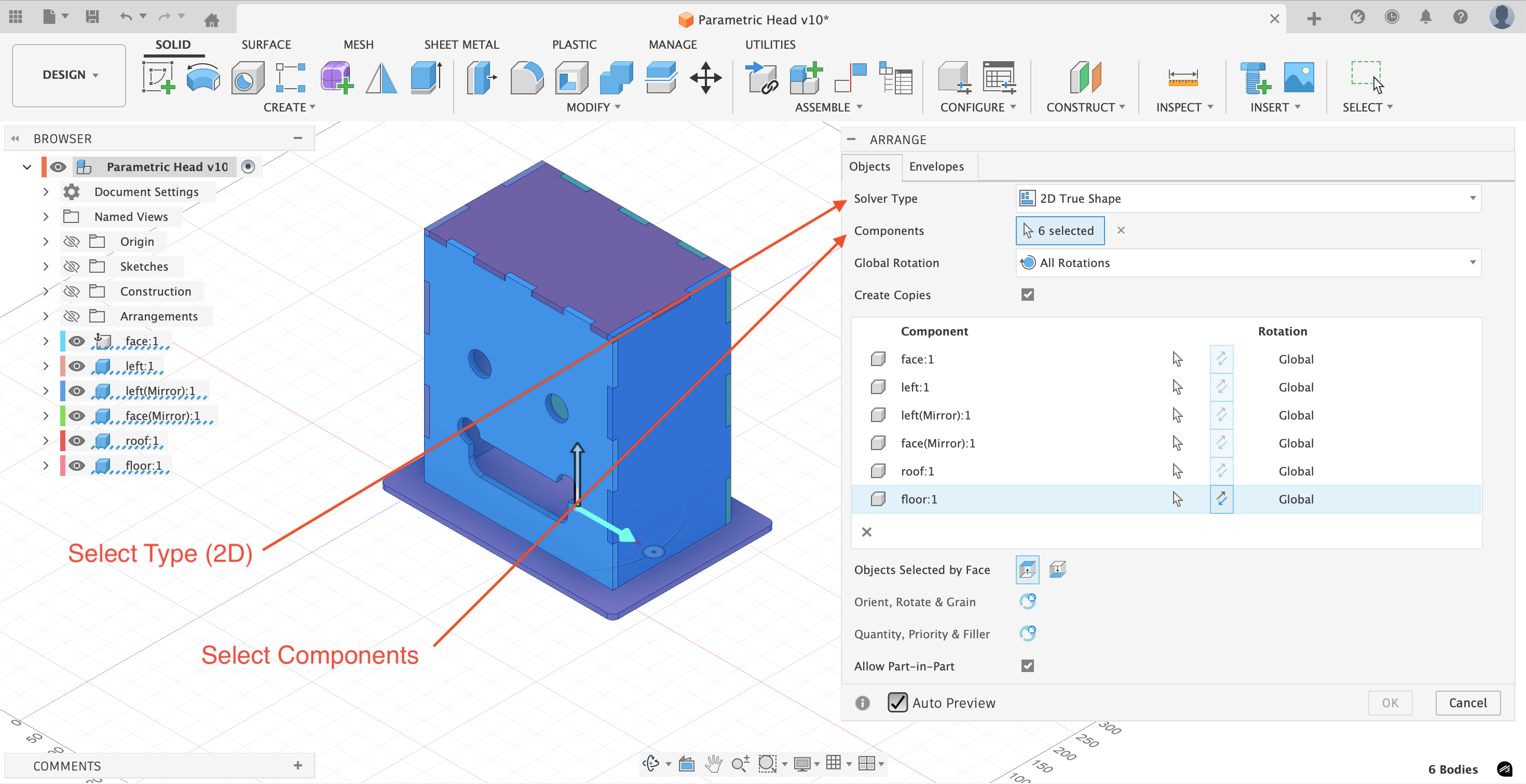 Now it's time to export. First we must arrange the components in 2D. Navigate to Modify->Arrange
