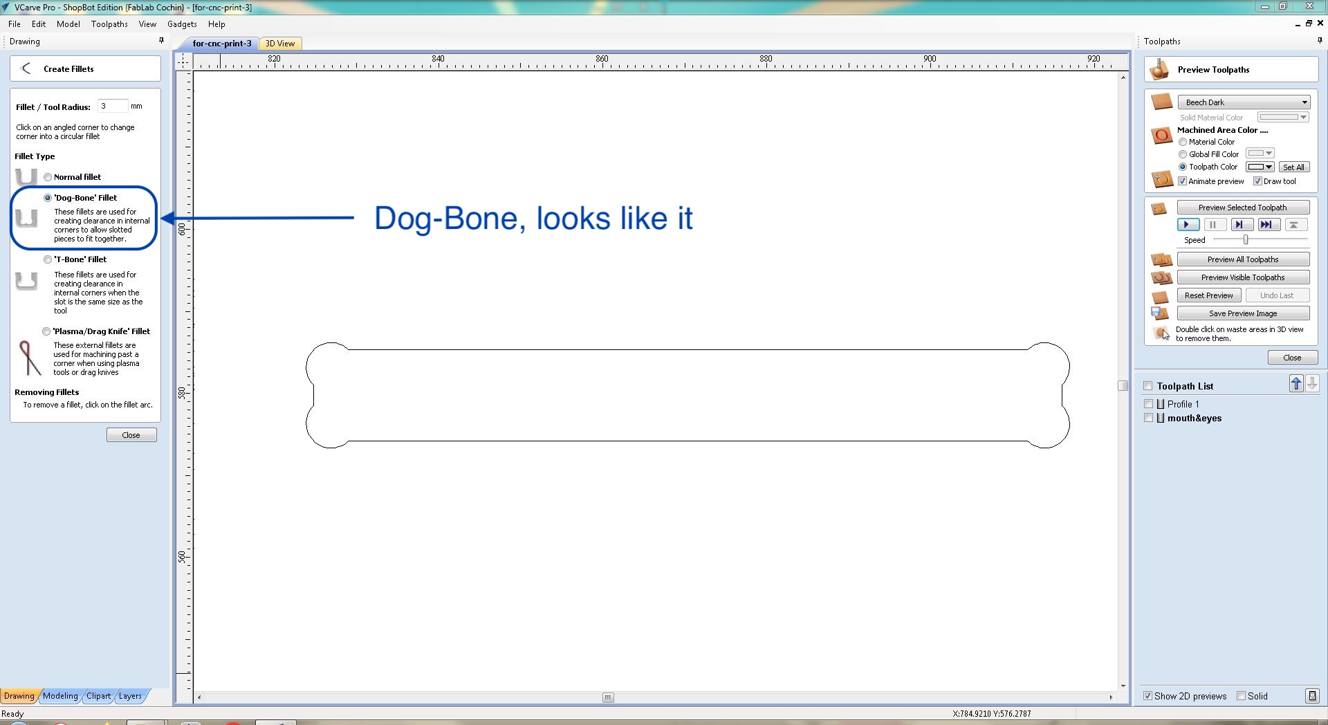 Then the next toolpath is for the slots on the bottom board. In this case we need to add "dog-bones" so that the tabs on the other pieces will fit in.