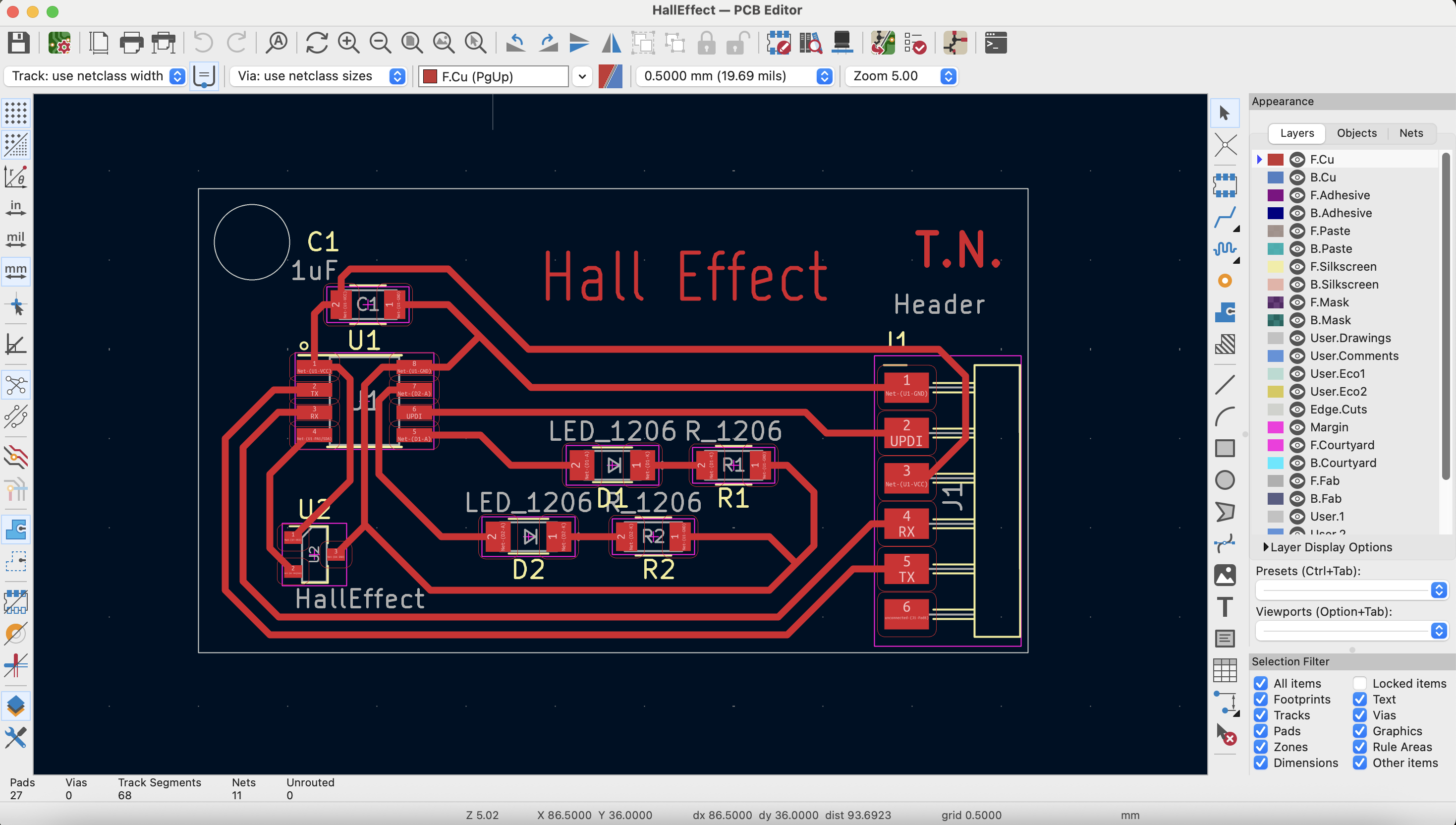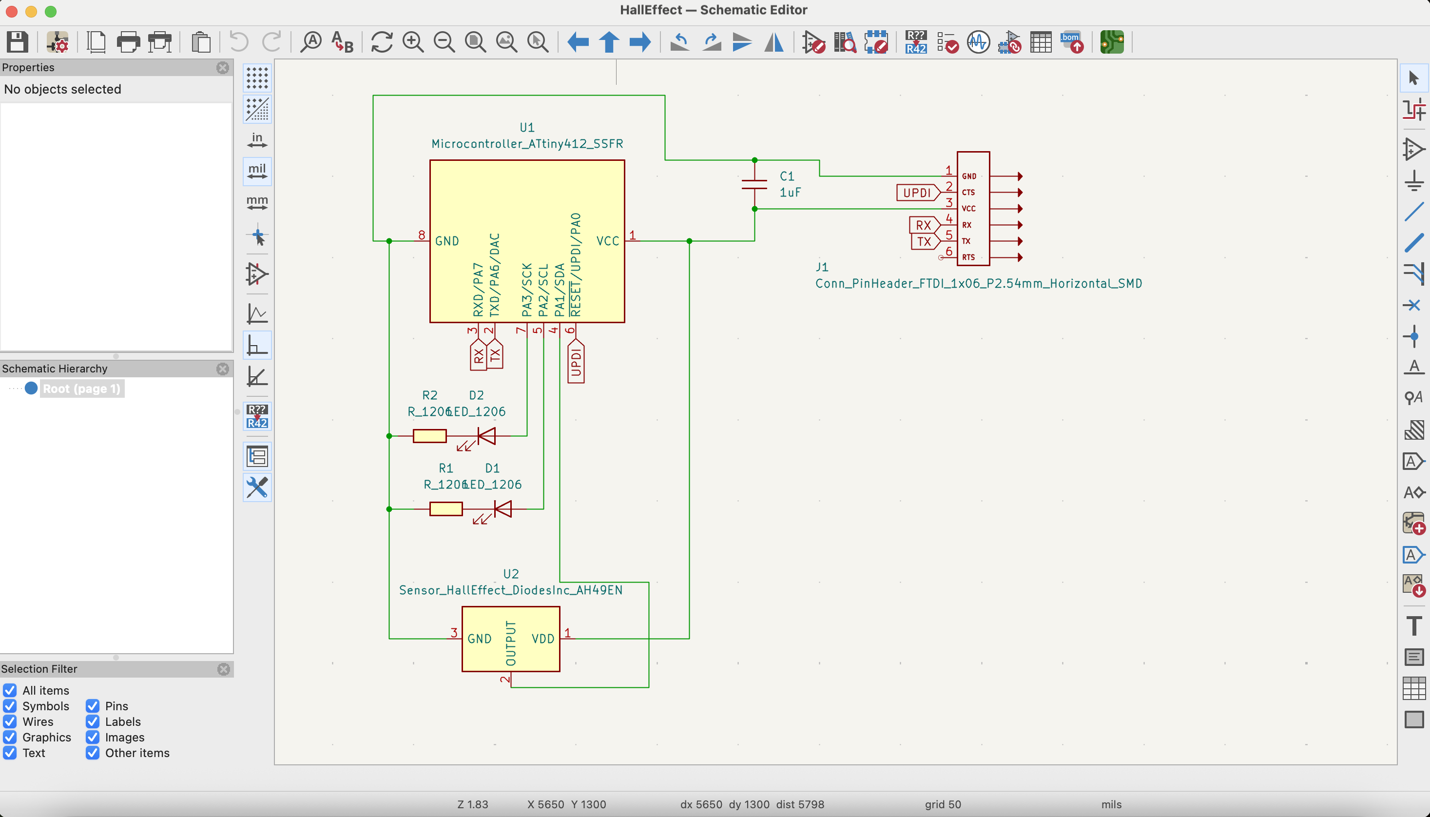 Since we want to use a Hall Effect Sensor and since wires are forbidden, we must make a new board. Let's go!