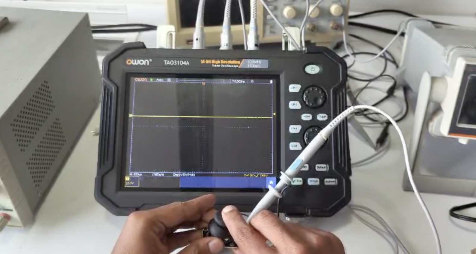 As we were many in the group, I also later went back to review my understanding and used the same oscilliscope to measure the output of my (digital) Hall effect sensor. As shown below it works and with clear digital result (detection / non-detection of magnet).
