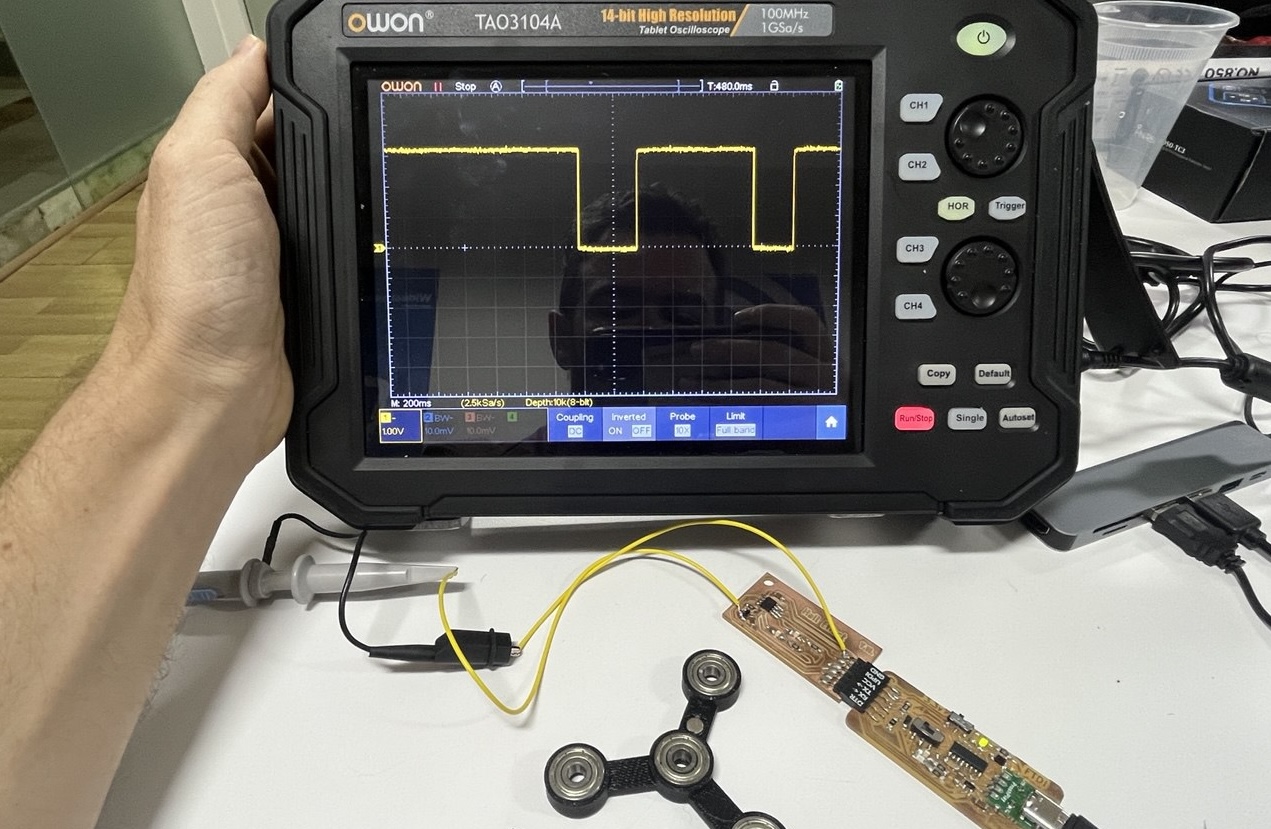 In the group assignment, we were meant to measure the output signal (voltage) of an input device visually by means of an oscilloscope. The group did that and documented on the group page. Two input devices were examined, namely a microphone and a joystick. For this to work, the device should be connected to power, and a probe from the oscilliscope connected to the output pin of the device to recieve the signal. It worked fine. Below is a screengrab of measuring the voltage of the joystick.