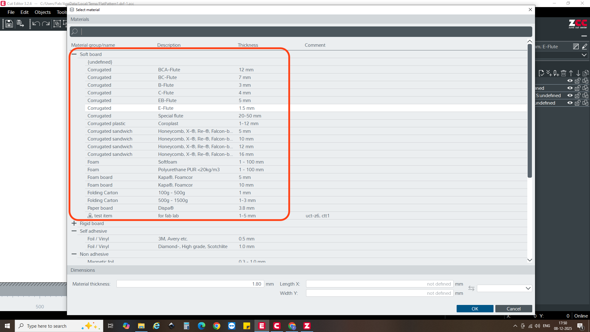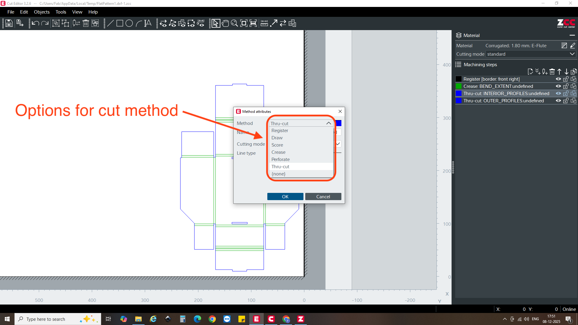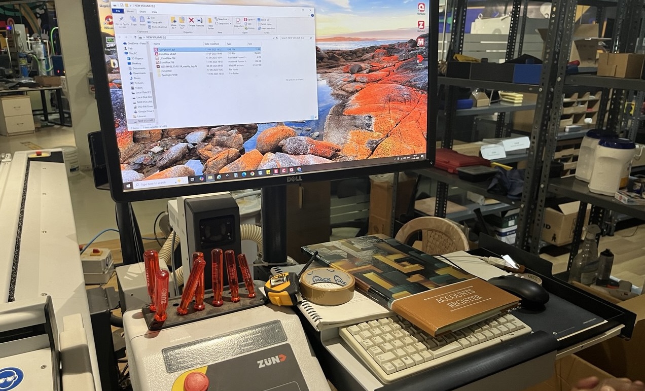 As we have finished the design in Fusion, flattened it, we must now export as .dxf and send that to the computer connected to the Zund machine. Here we see the set-up with our .dxf file (available below) about to be opened...