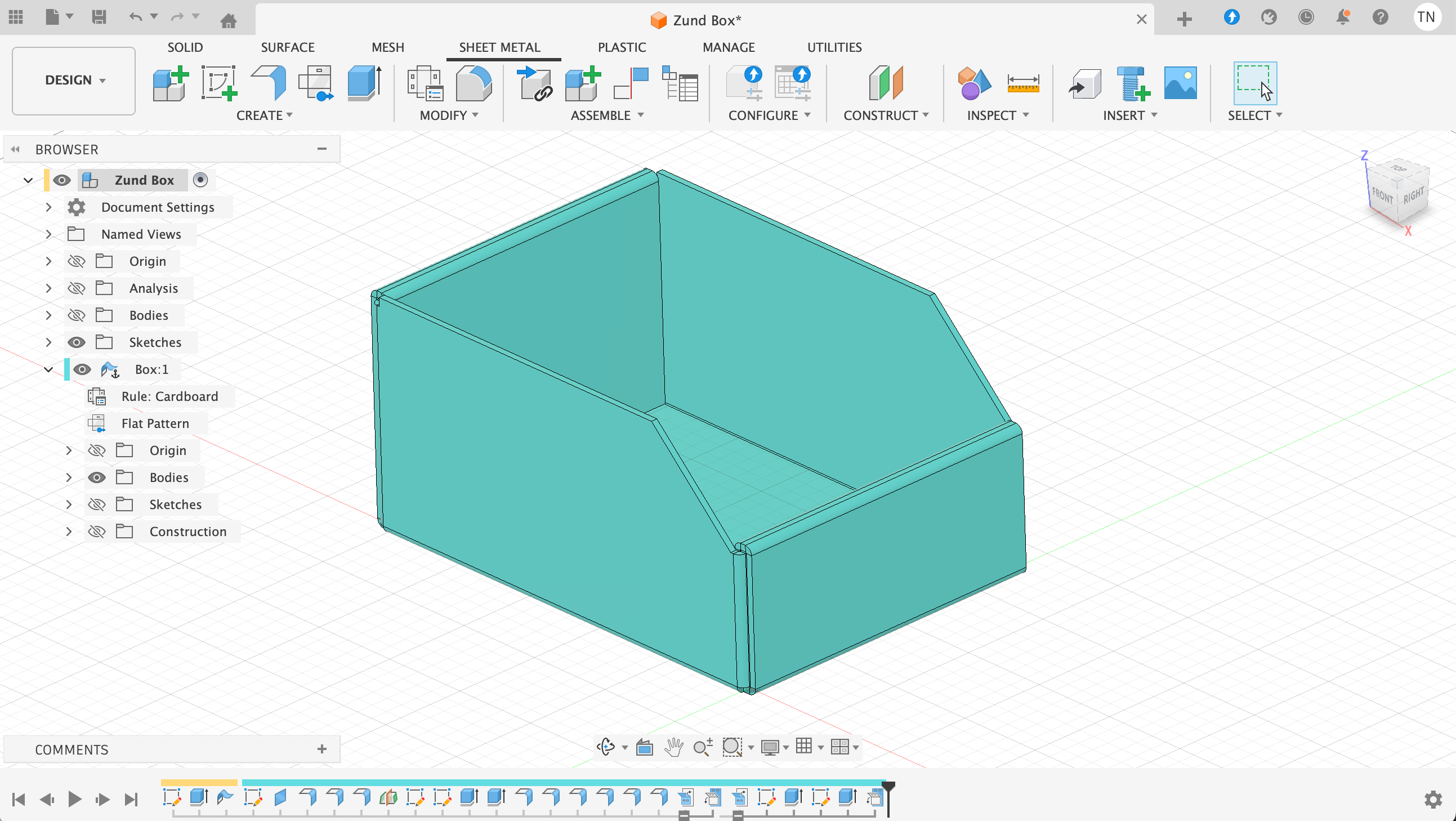 Having learned the basics of modeling a box, in particular about flanges (bent faces), I was able to proceed without such difficulty. Here is the box more than half complete, and already note the number of flanges in the timeline. Again, flanges are simply bent faces, so any time we want to bend cardboard we need to click the option for a new flange!