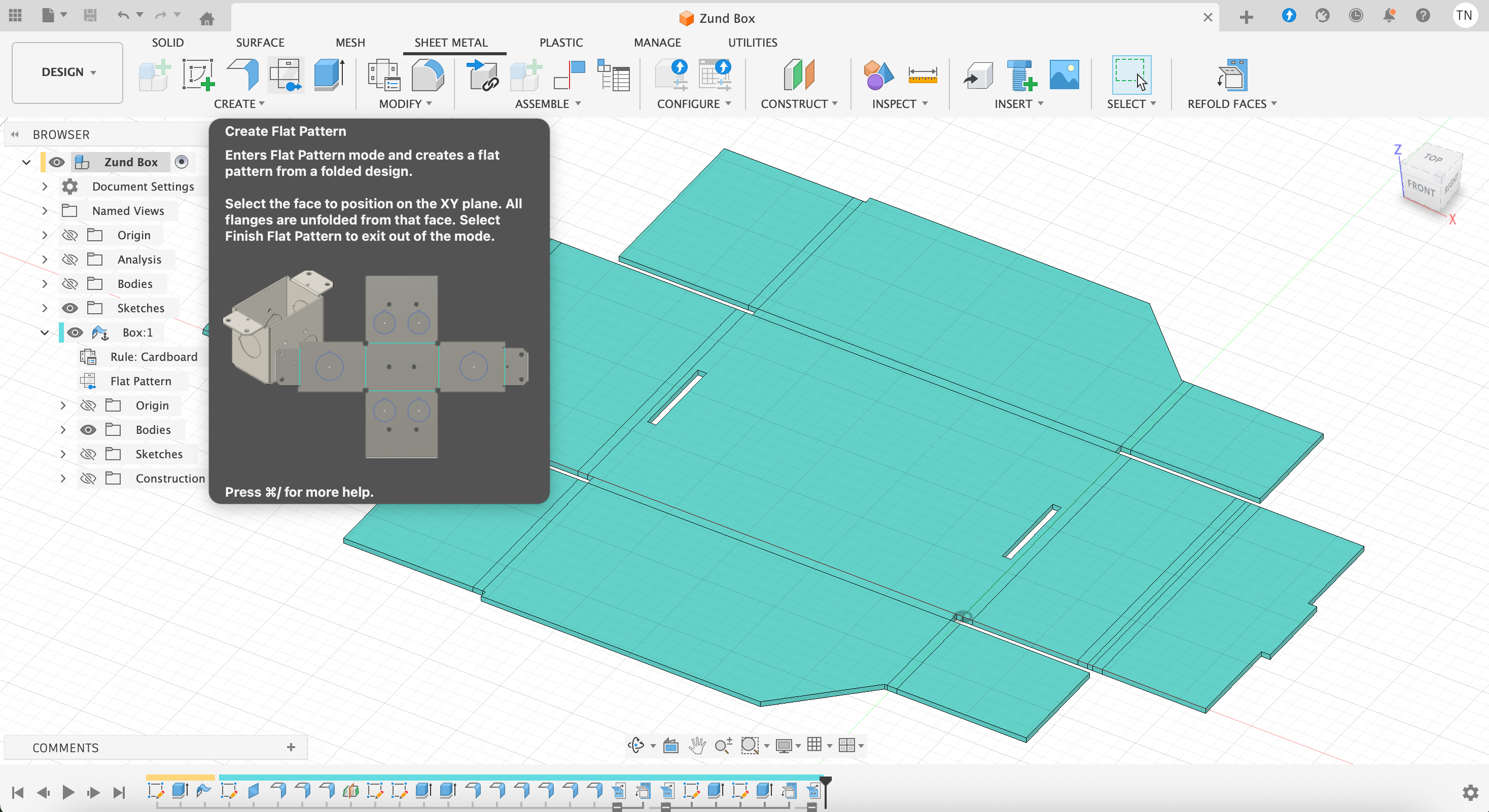 To unfold the box, we navigate to "Modify"->"Unfold". We must subsequently choose the stationary entity (bottom of box) and which bends to unfold (all).