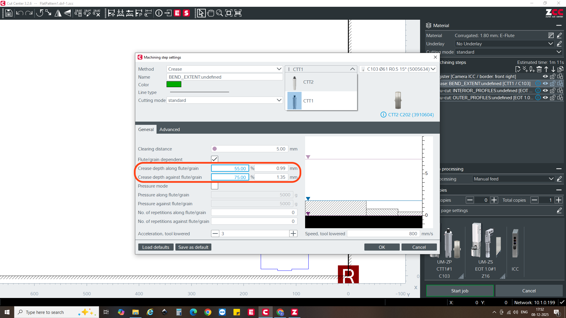 For example, within the Cut Center for "crease" we have some very particular options to choose from, here for example we may choose the depth of crease, further specifying extent of crease both with and against the grain.