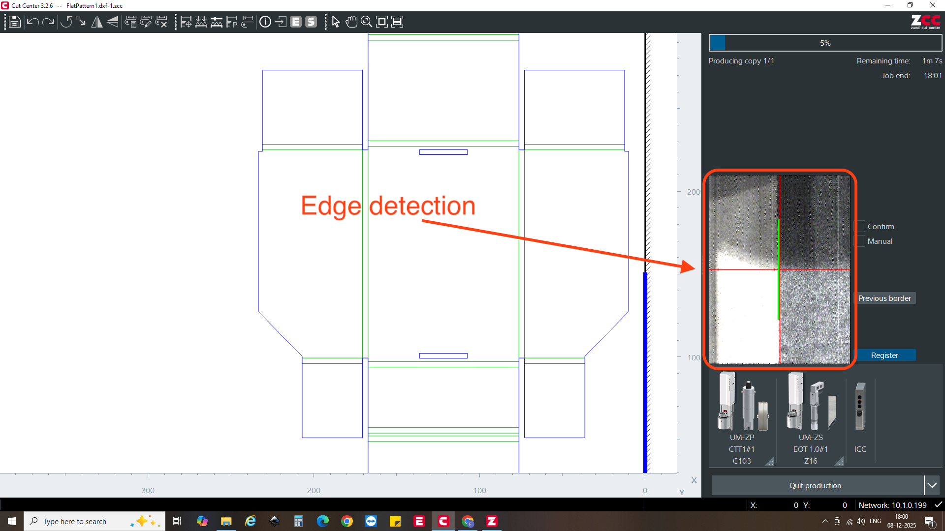 Within the Cut Center there is also a process of edge detection, where the camera on the gantry is utilized to both find and verify places on the material for cutting.