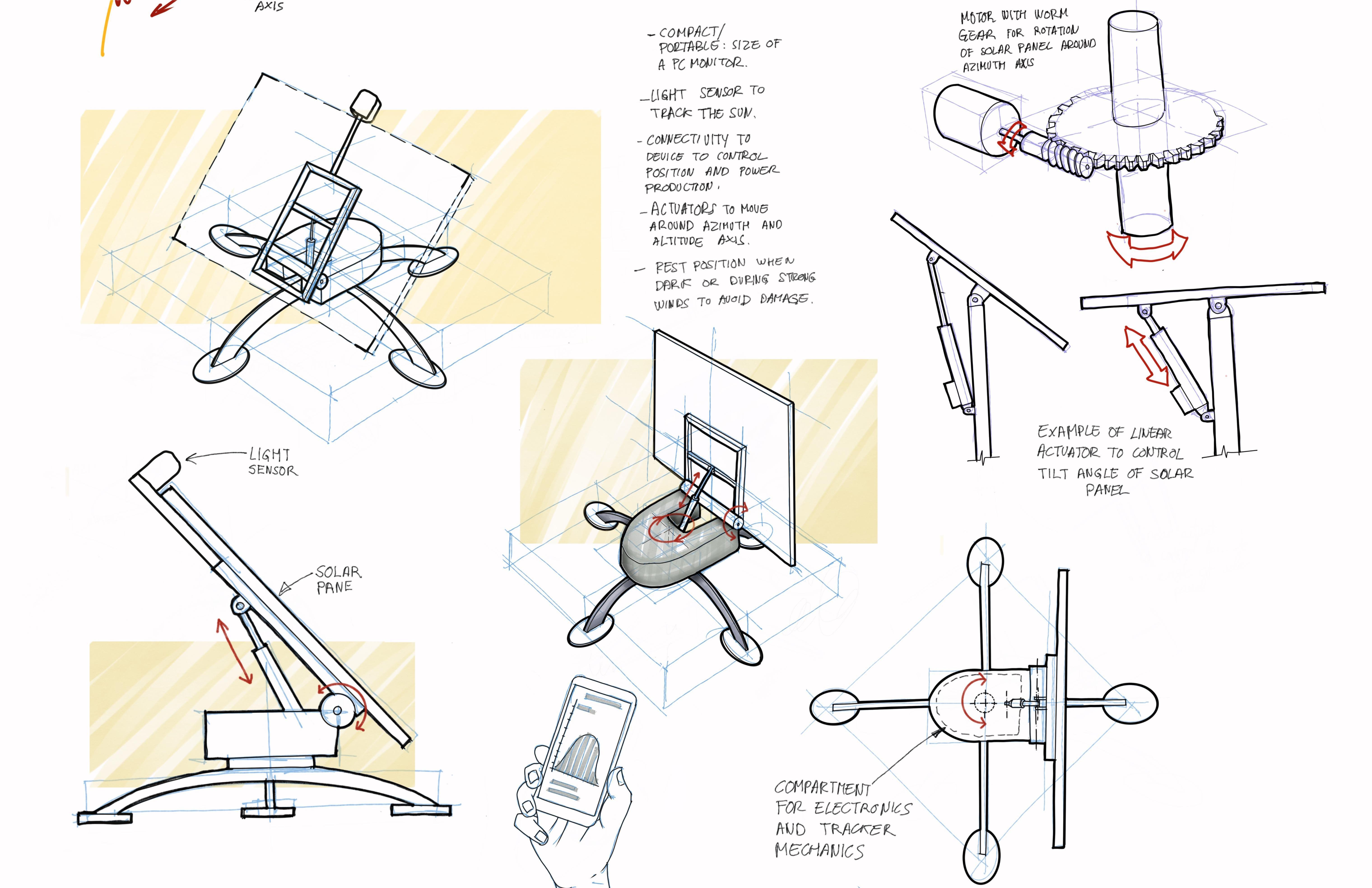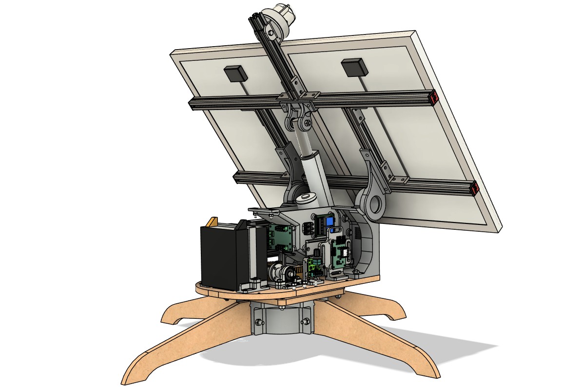 The project is an automatic dual-axis sun-tracking device for a small photovoltaic (PV) panel. The product operates autonomously and is self-powered by a 12 V rechargeable battery charged from the PV panels. The battery supplies the tracking system and a 12 V DC outlet
