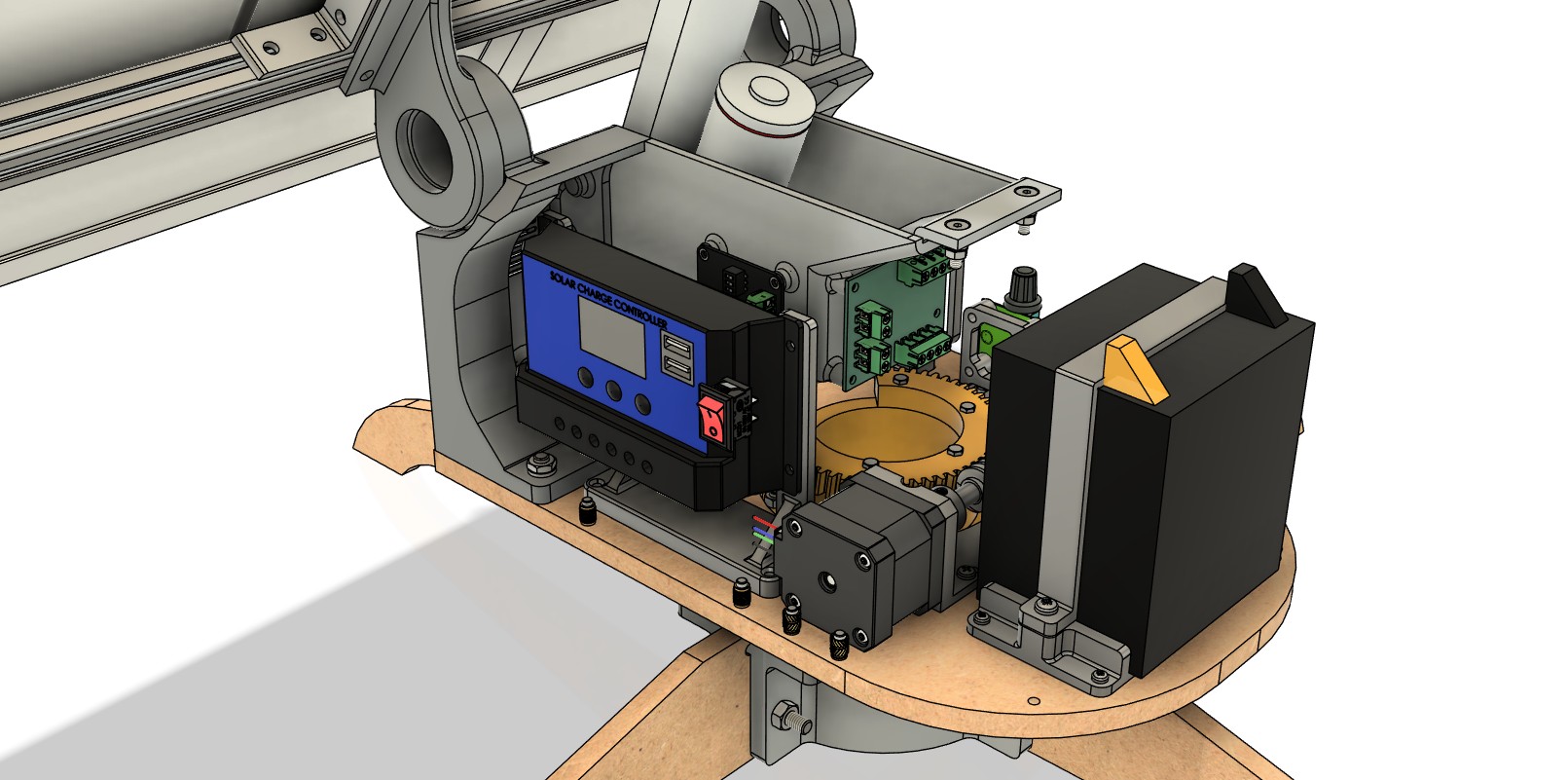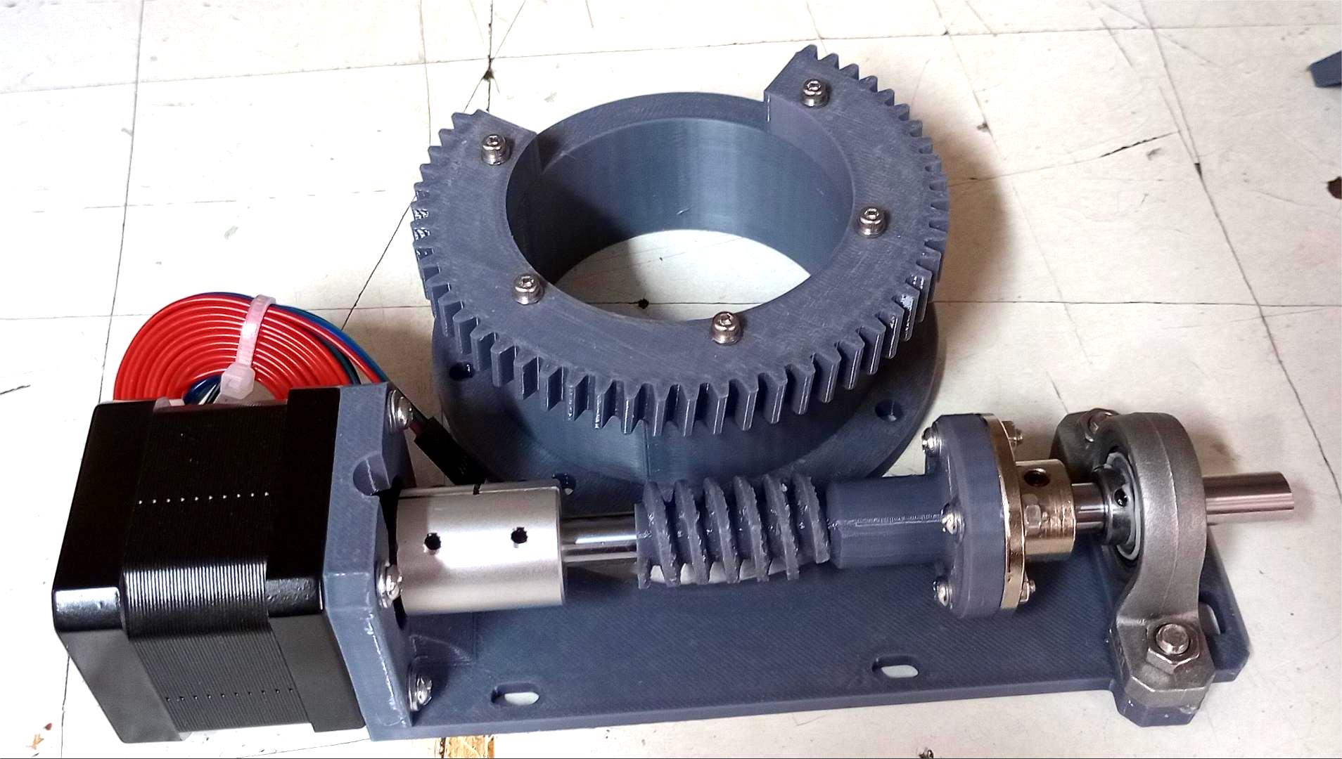 Azimuth motion is achieved with a stepper motor driving a worm gear that connects to a helical gear. This compact transmission provides a high reduction ratio, high output torque, smooth operation, and practical self-locking behavior that resists back-driving from wind loads.