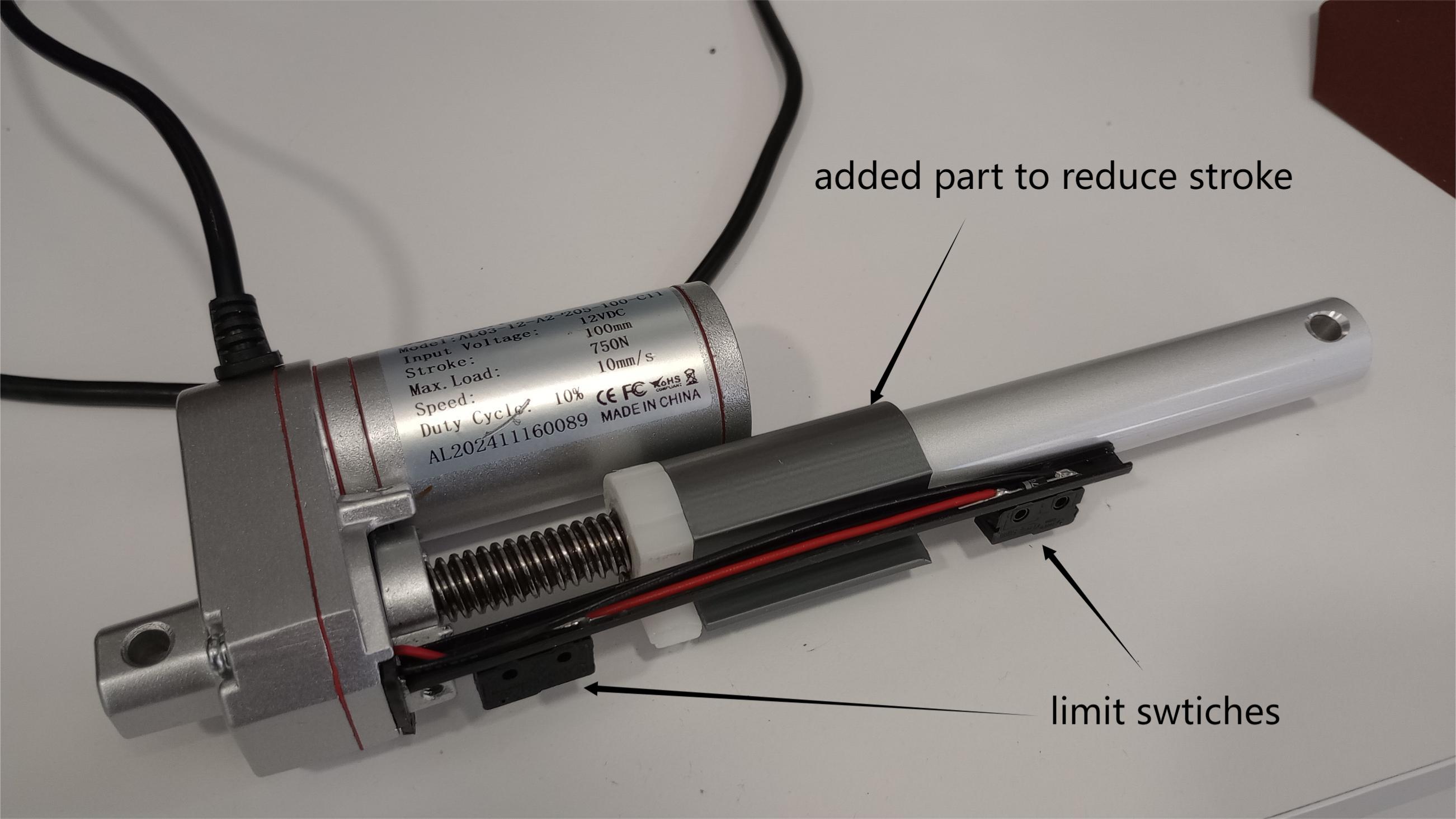 Elevation is achieved with a 12 V linear actuator, with the motor end fixed to the tracker base and the rod end attached to the panel sub-frame. The purchased actuator had a 100 mm stroke, which exceeded the travel needed to go from horizontal to vertical. Rather than adding external limit switches (which would consume extra pins on the microcontroller), I reduced the stroke by inserting a 3D-printed part that activated the internal limit switches.