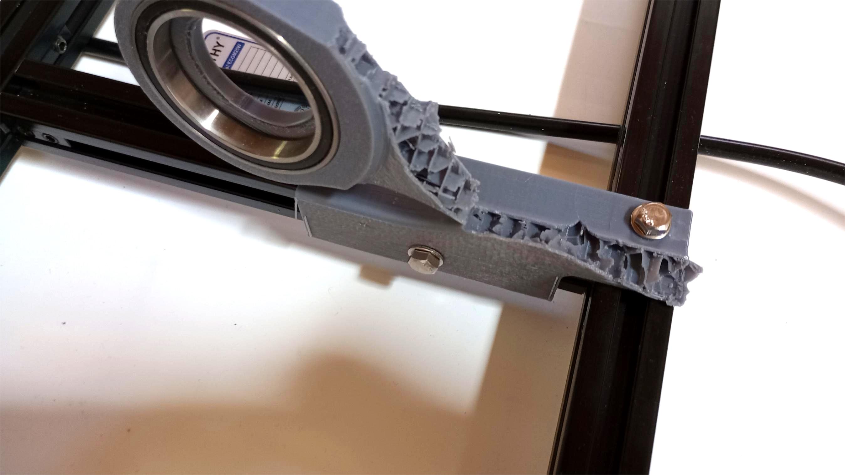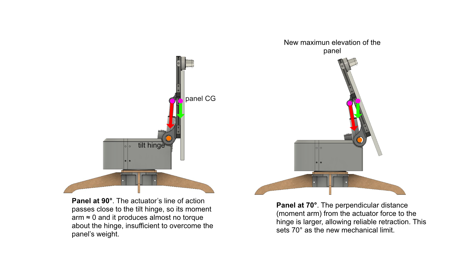 An initial testing allowed the panel to reach a near-vertical position. From that position, retracting the actuator did not tilt the panel back down because the linkage angle was too shallow, producing mostly axial load. This pulled on the panel lugs and broke this part and one hinge.