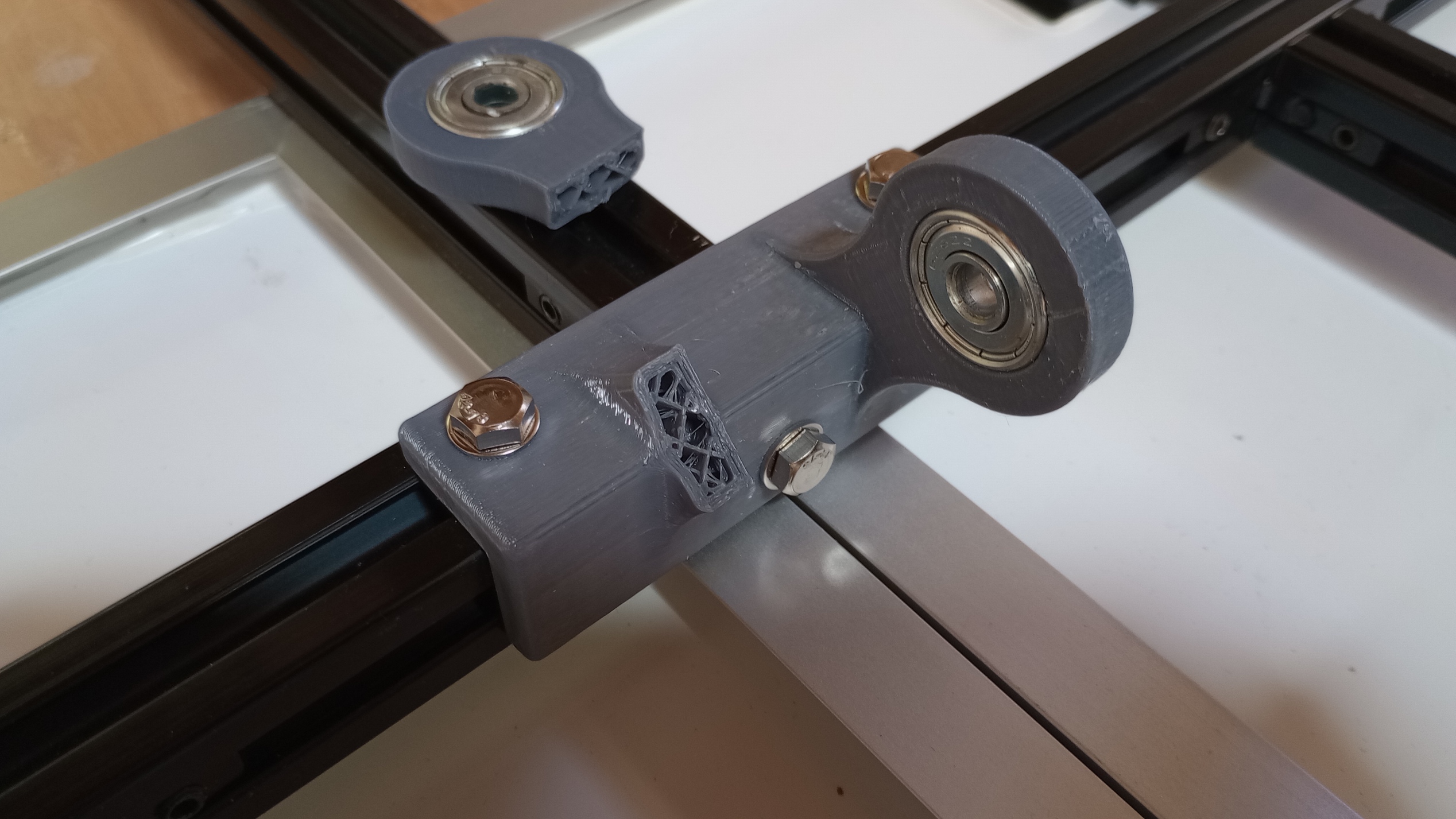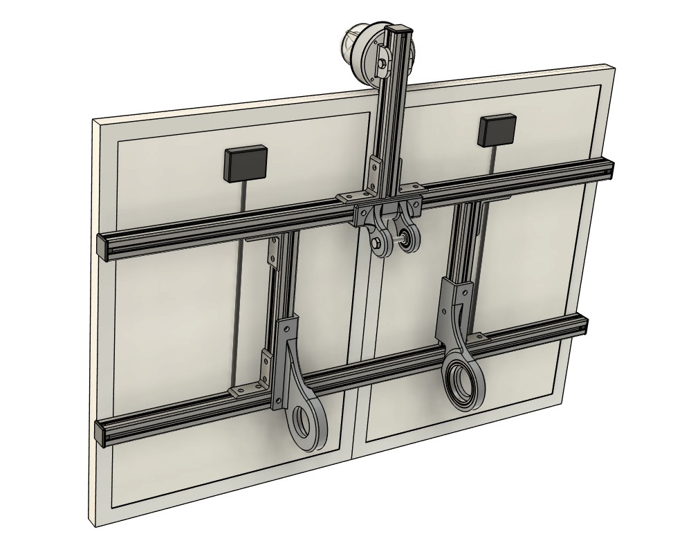 The panels mount to an aluminum 2020 T-slot frame joined with corner connectors. Hinges, brackets, and the sensor are fastened with T-nuts and bolts.
