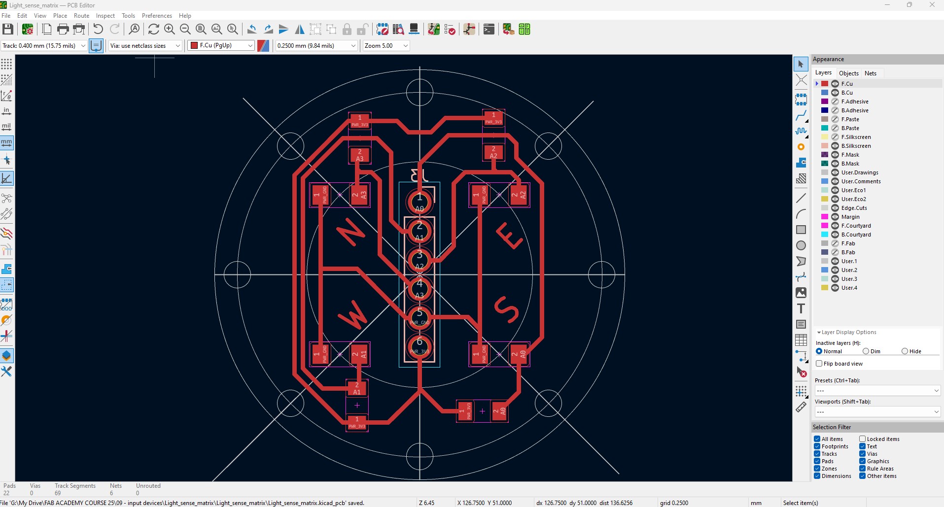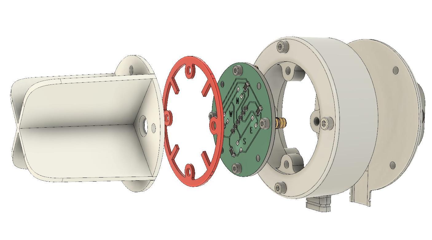 A phototransistor sensor array with baffles provides directional light sensing for tracking. The PCB is circular with four phototransistors and a through-hole pin header on the reverse side. A 3D-printed enclosure with four internal baffles protects the PCB and wiring and mounts to the aluminum T-slot frame.