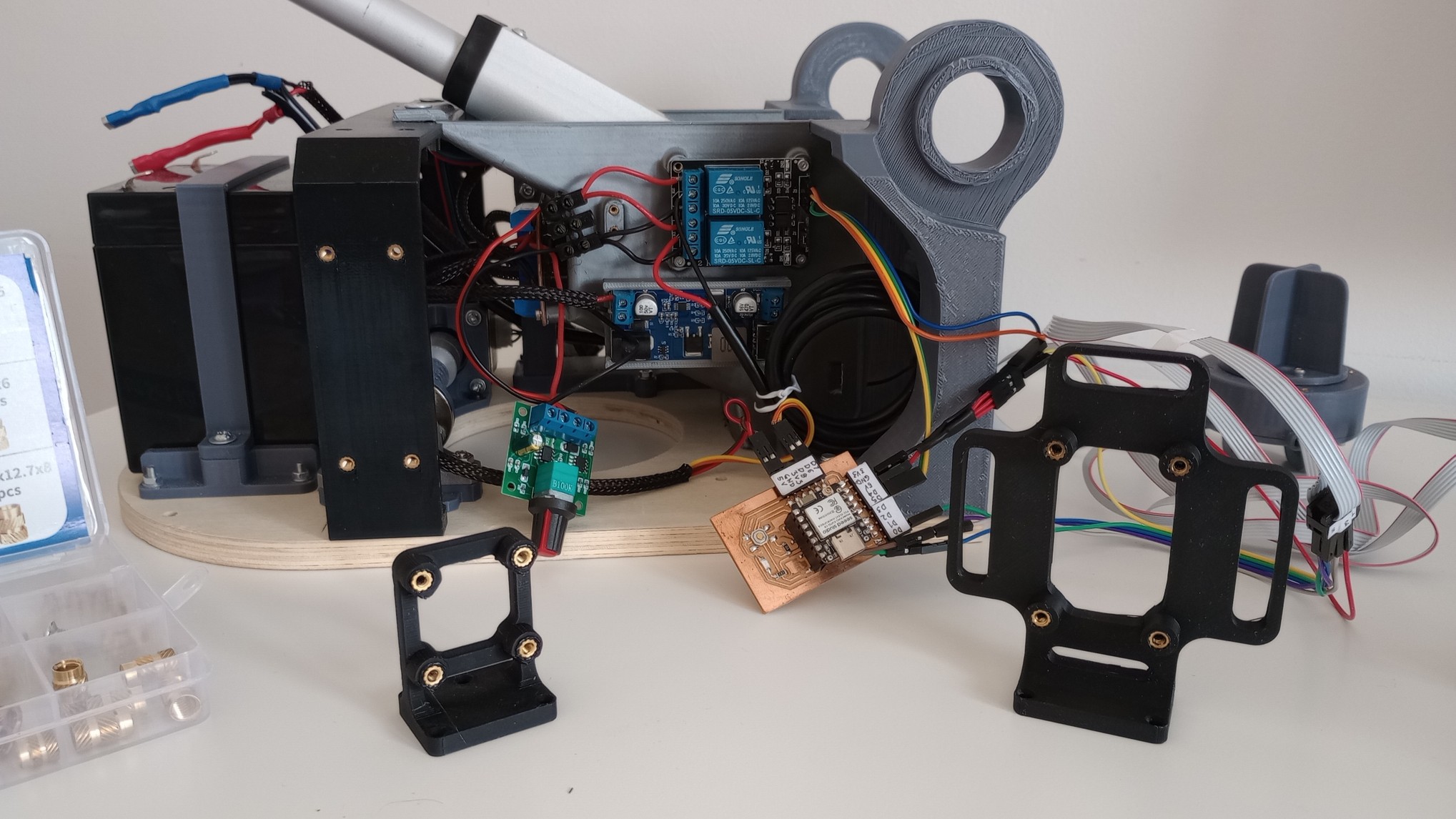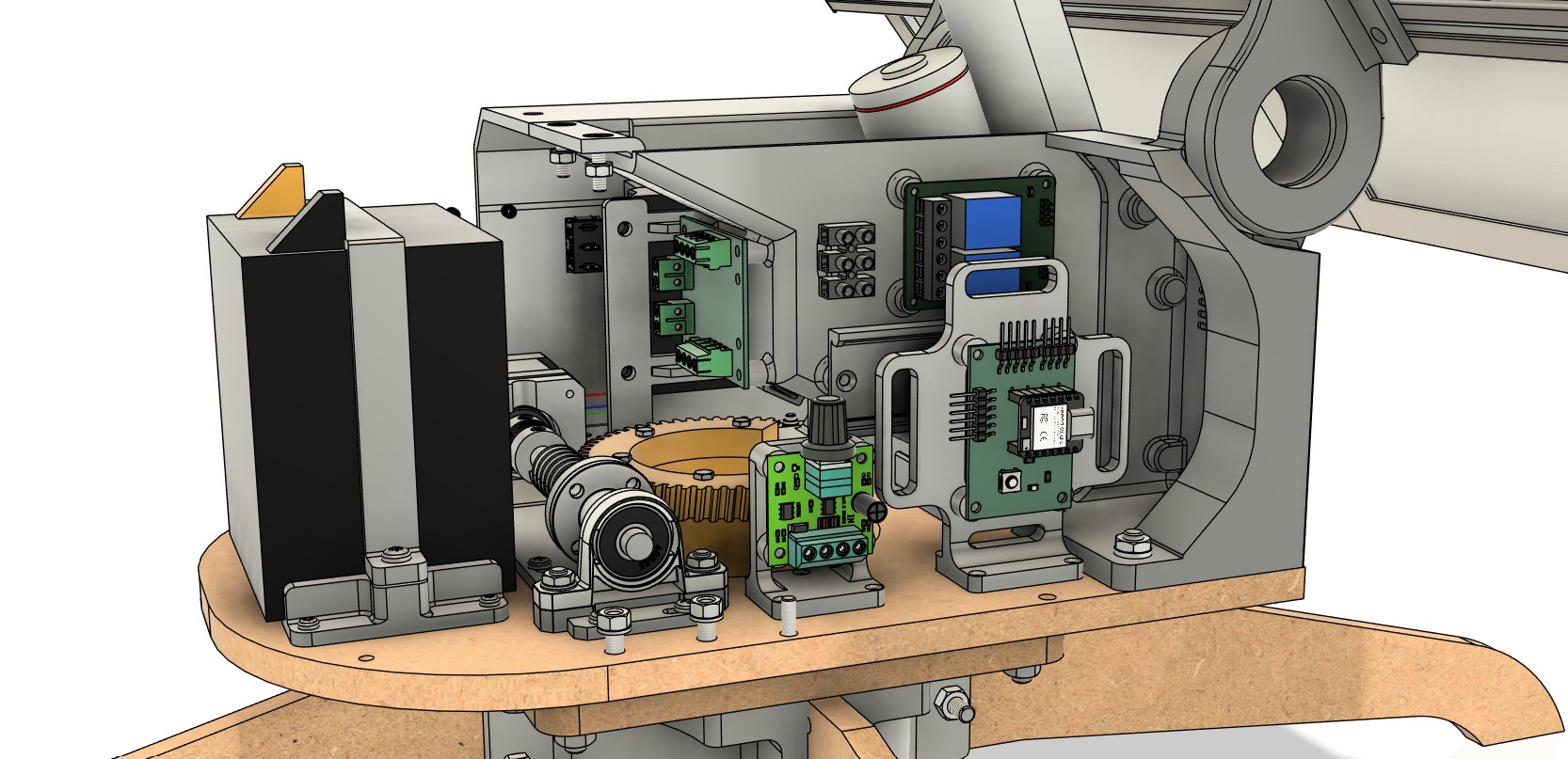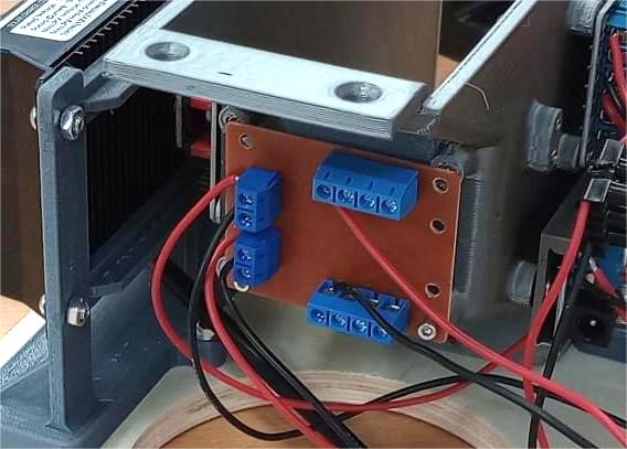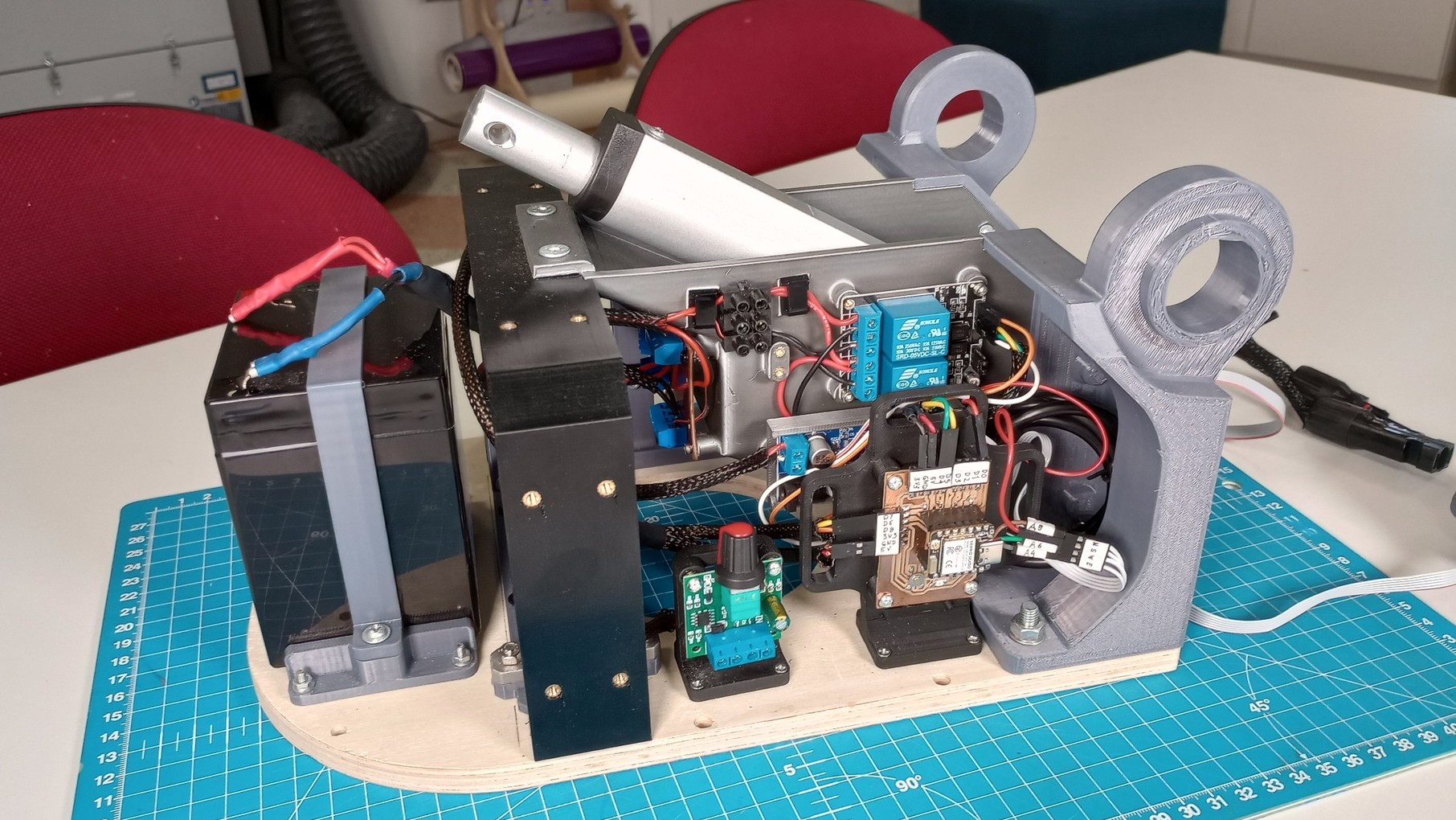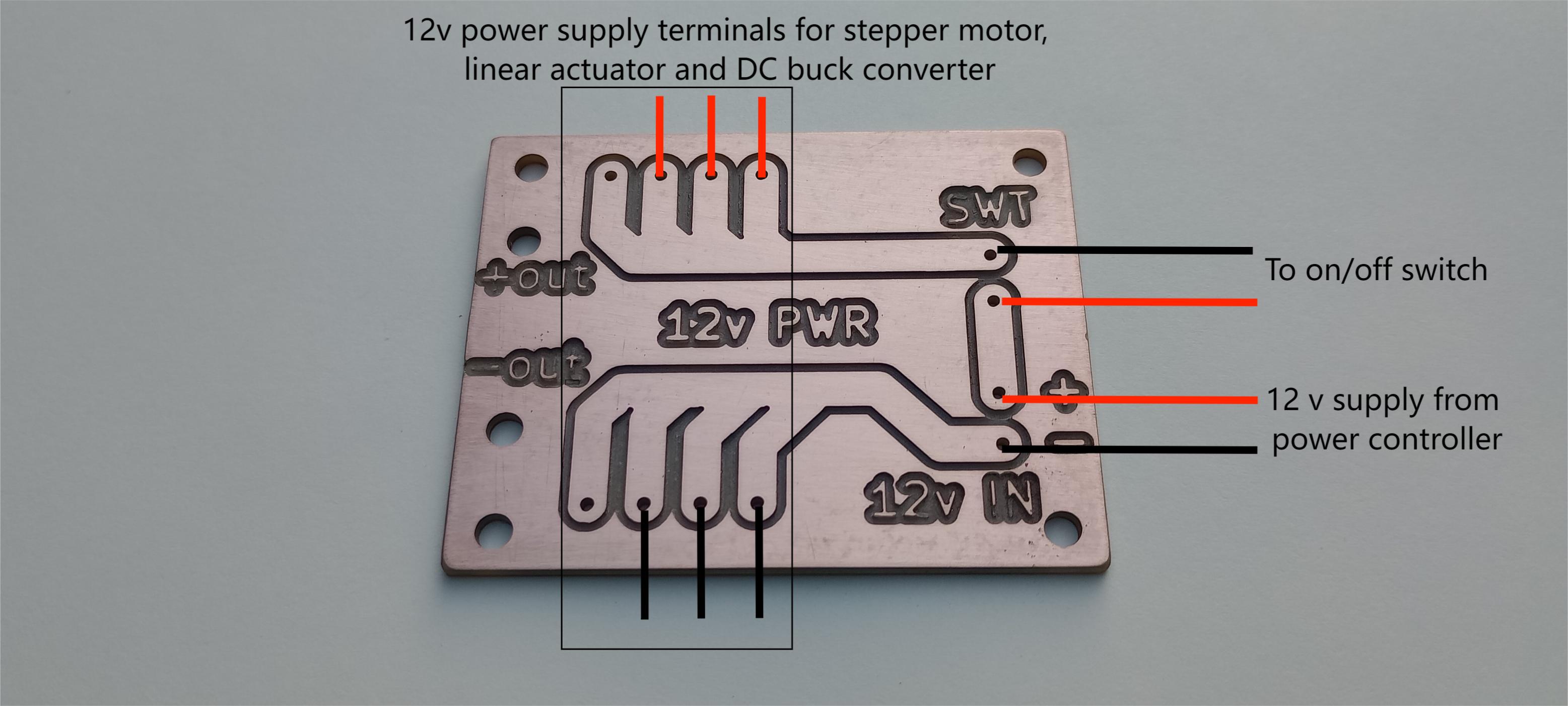 - A custom power distribution PCB provides terminal blocks for the linear actuator and stepper motor.