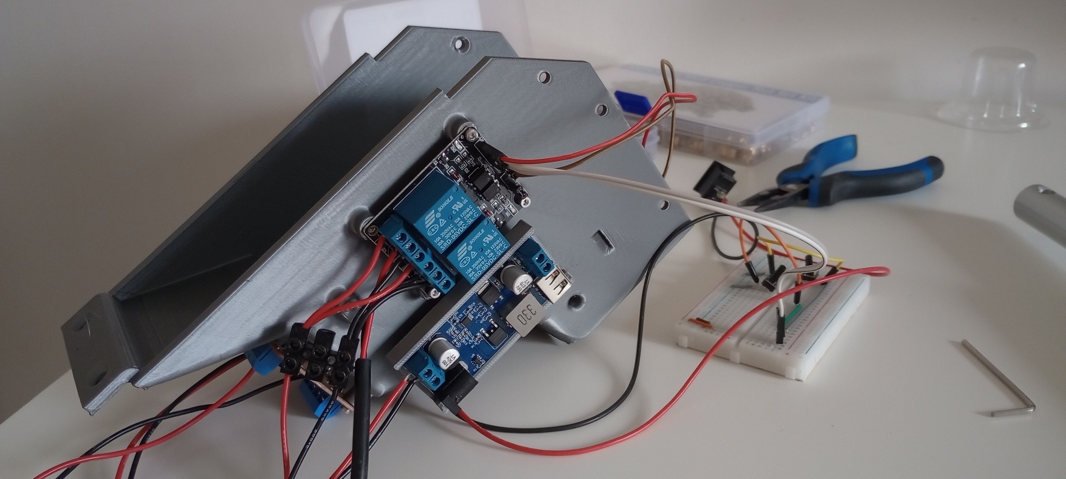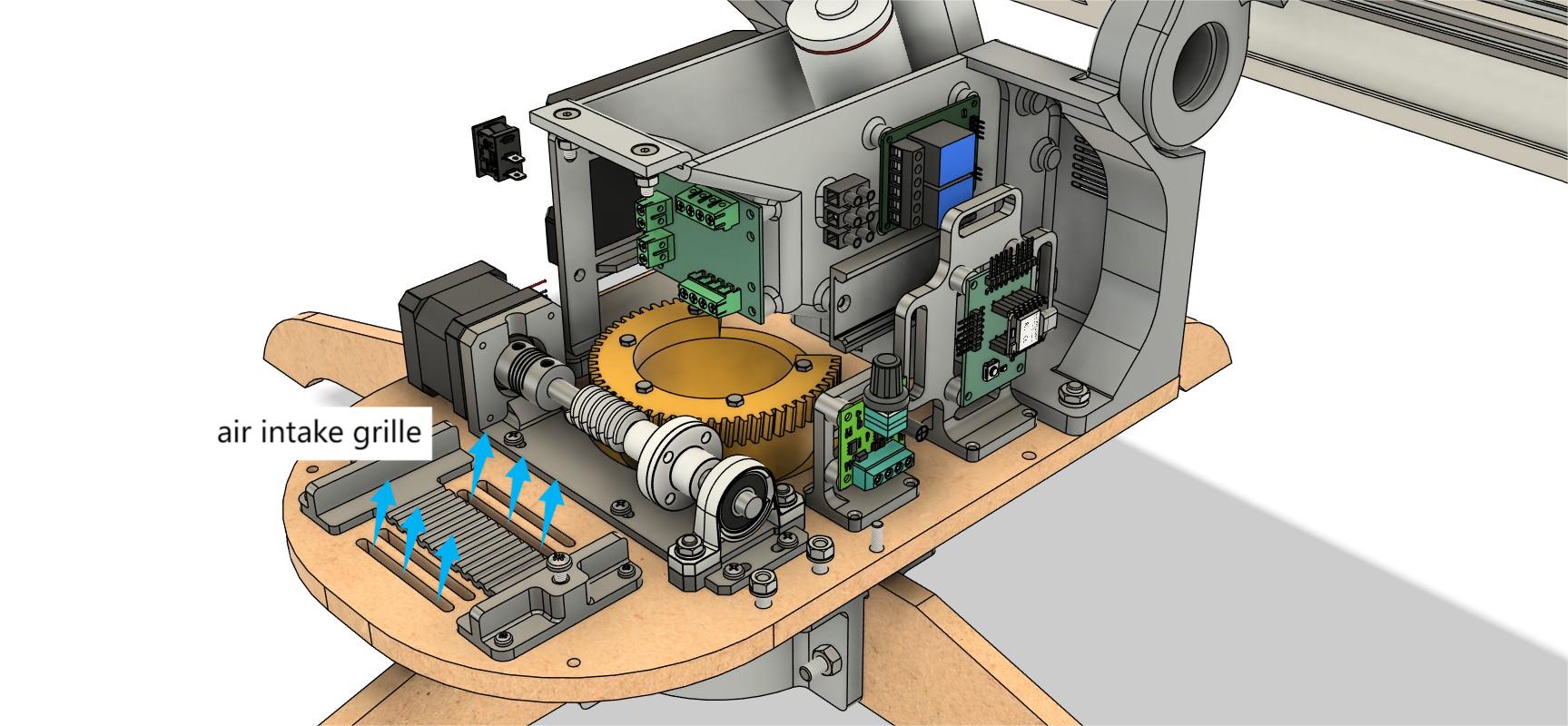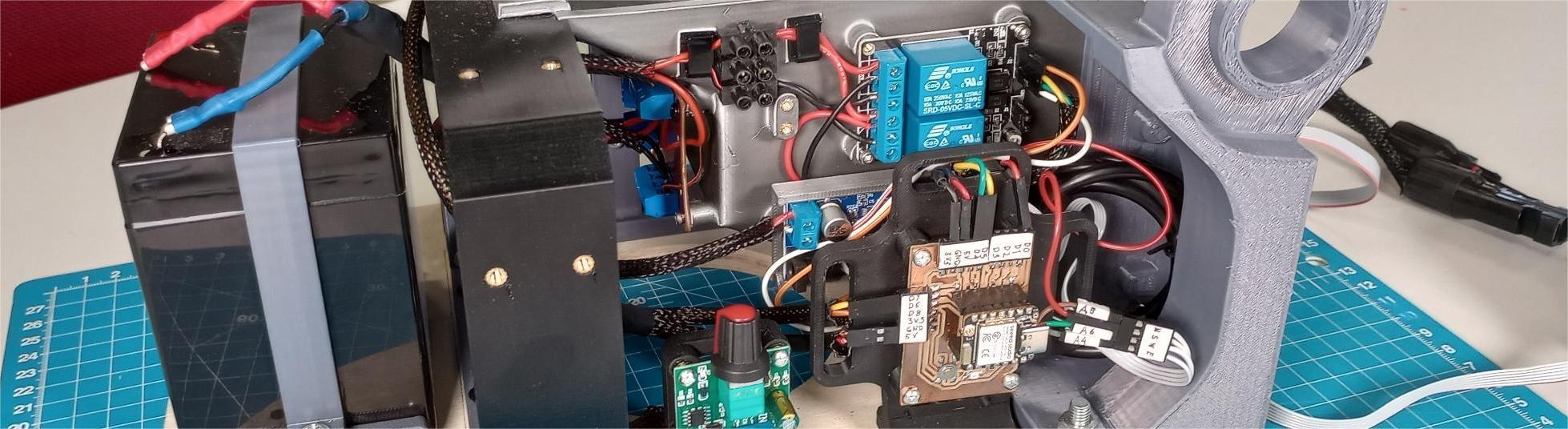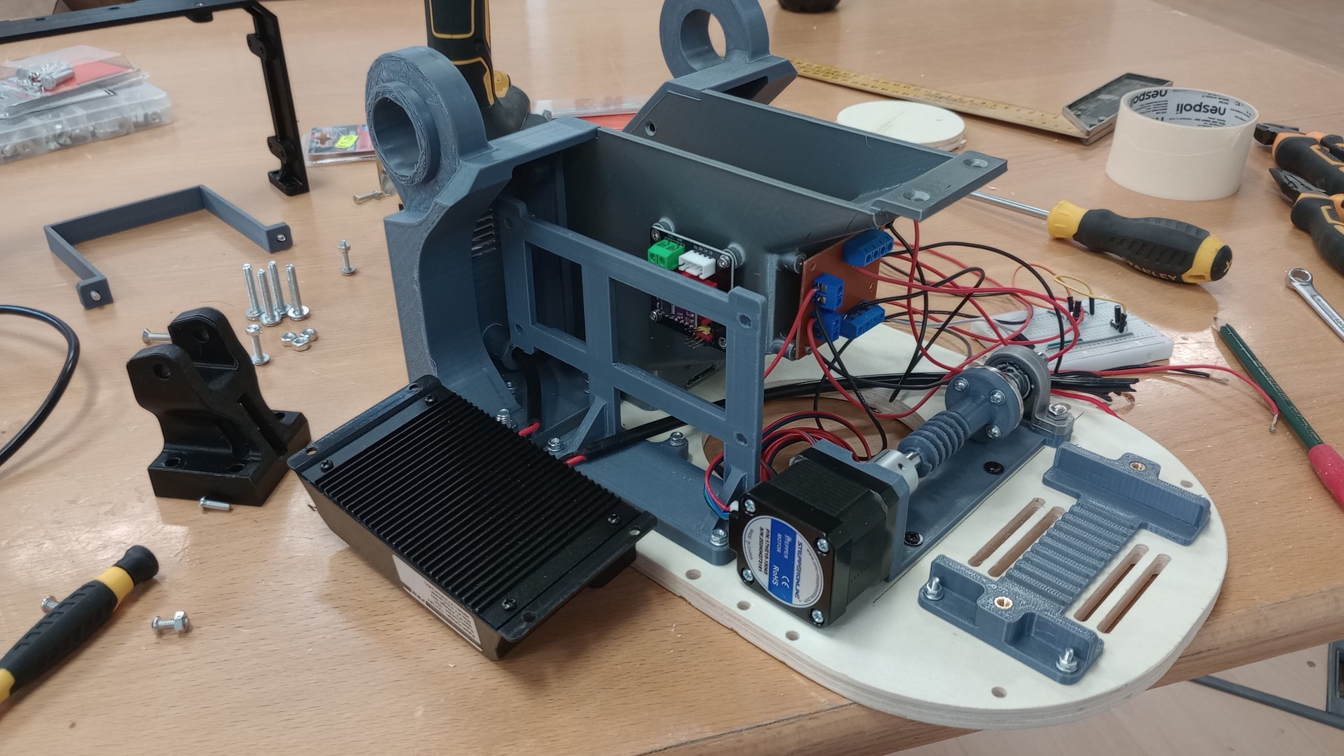 - A custom power distribution PCB provides terminal blocks for the linear actuator and stepper motor.
