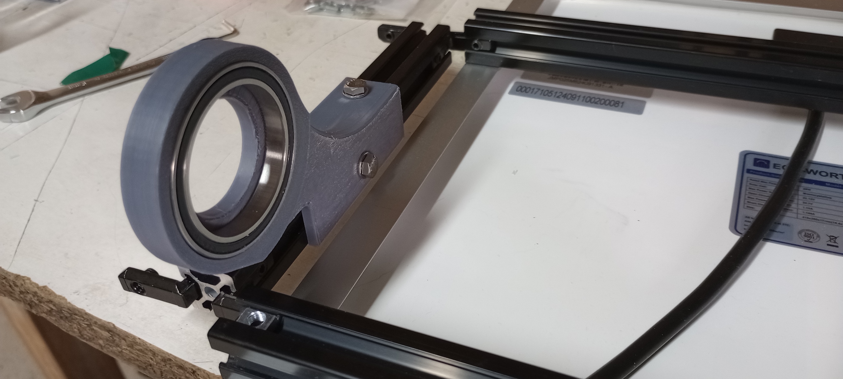 The main axle is coupled to the stepper motor with a flexible coupling to accommodate minor misalignment, damp vibrations, and absorb shocks for more reliable operation. The opposite end of the axle is supported by a ball-bearing block mounted to a 3D-printed bracket that integrates the sub-system. The motor + worm gear mount includes slotted holes for fine alignment to ensure proper gear coupling.