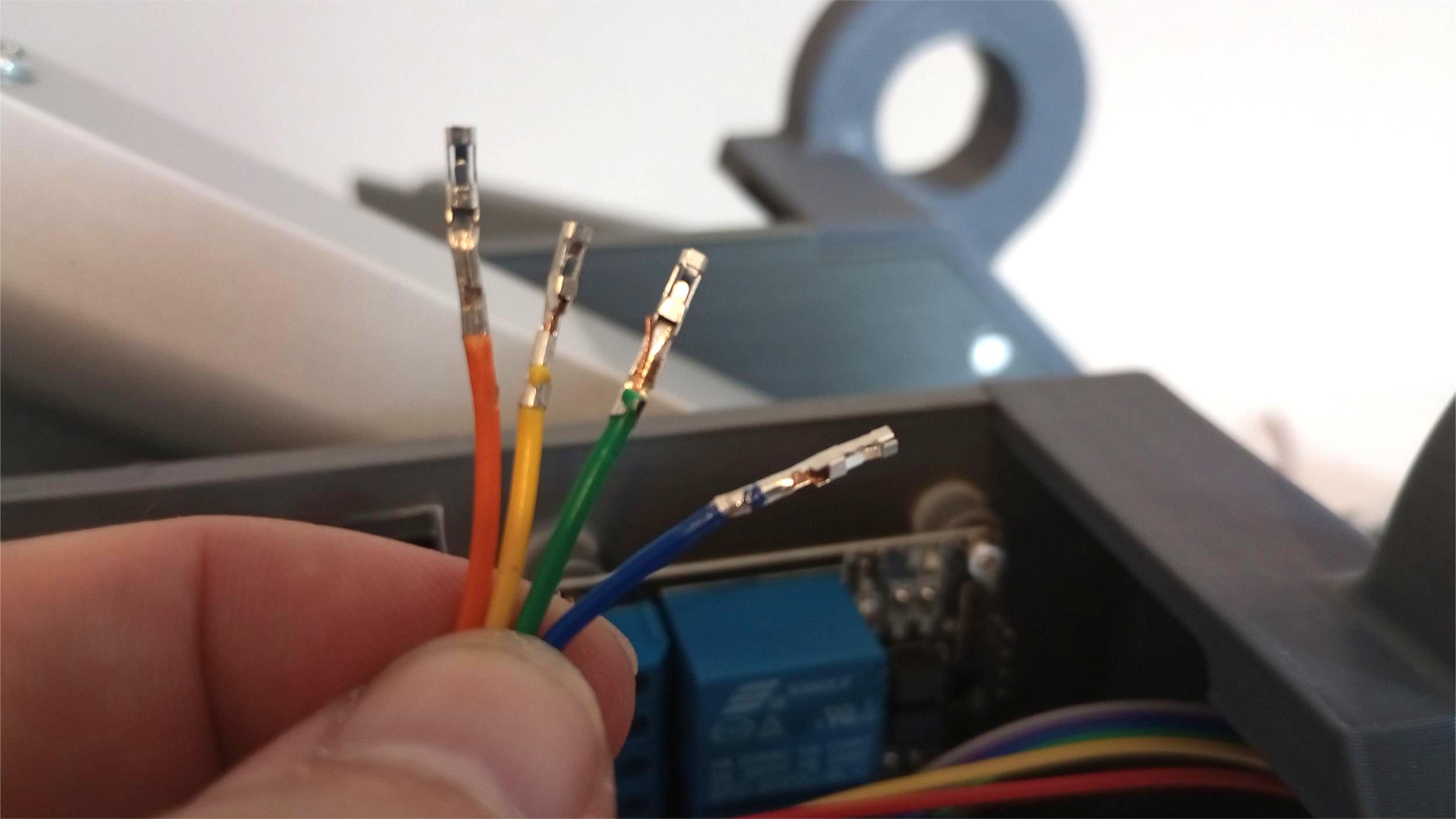 - Harnessing with heat-shrink, braided sleeve, and adhesive cable clips for routing.