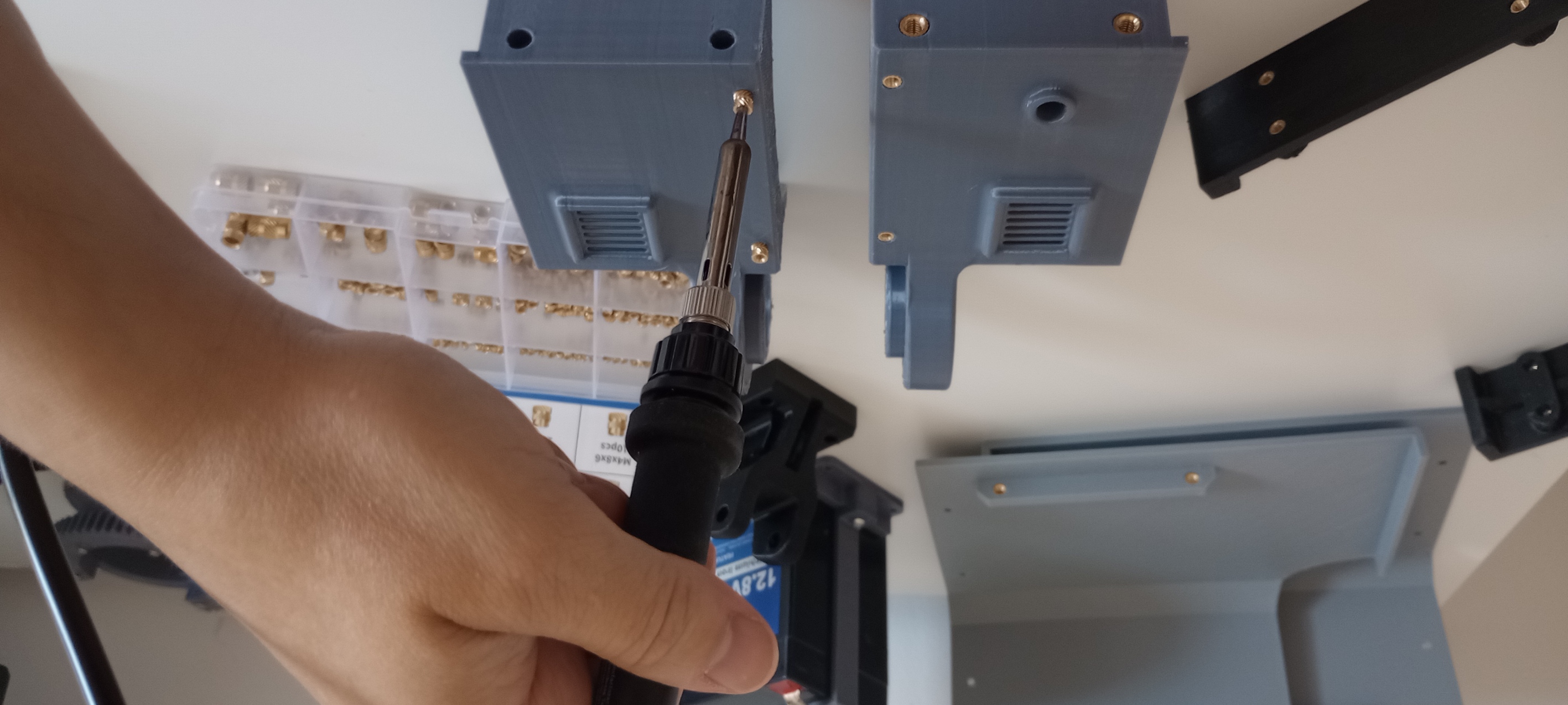 The enclosure was sized to house all electronics with clear access once the outer covers are removed. Each module has a dedicated mounting frame or uses integrated bosses; parts are fixed to a 10 mm plywood base with self-tapping screws (small parts) or bolts/nuts for higher loads. Many fasteners are countersunk to keep the base surface flush. Heat threaded inserts are used in 3D-printed parts for durable threads.