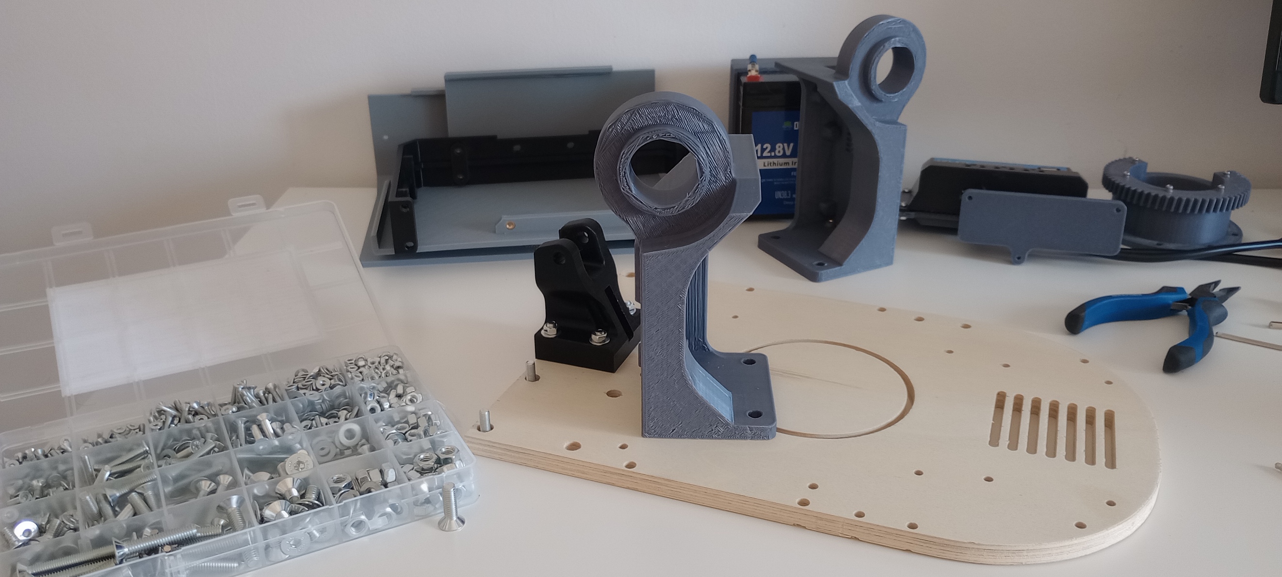 - Enclosure:electronics and powertrain (wiring, battery, actuator, stepper, gear train), internal supports, and outer panels.