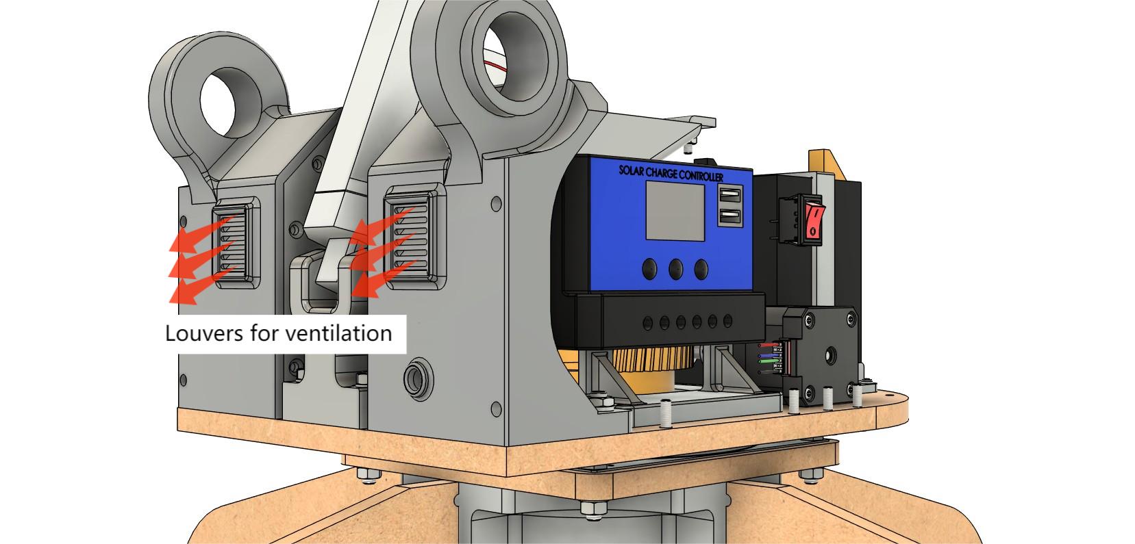 Serviceability is achieved by removing three outer panels to expose the electronics and connectors. For outdoor operation, passive ventilation slots at the base and louvered exhaust openings were added to reduce heat buildup while minimizing water ingress risk.