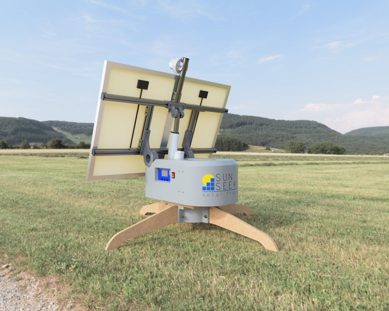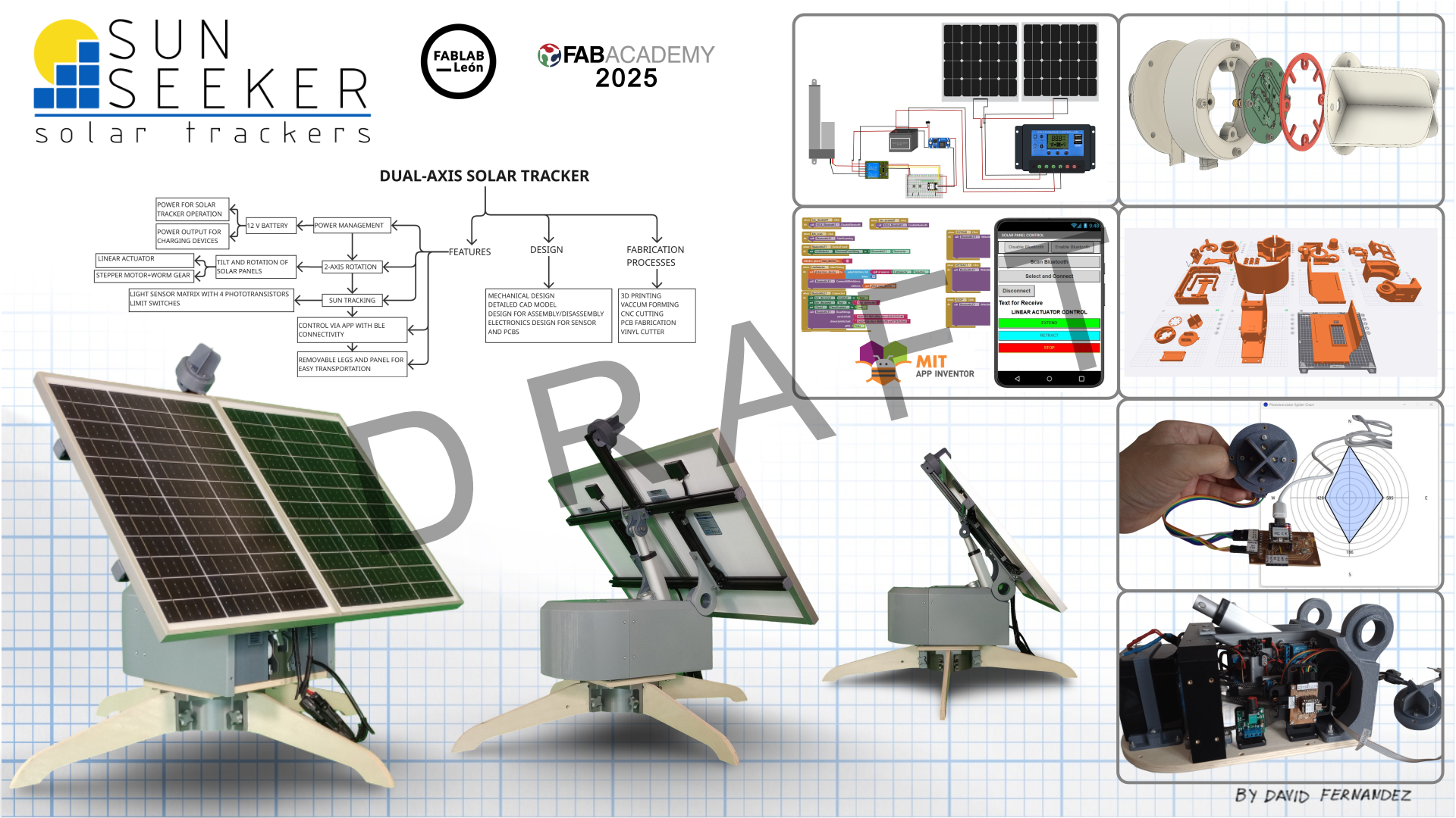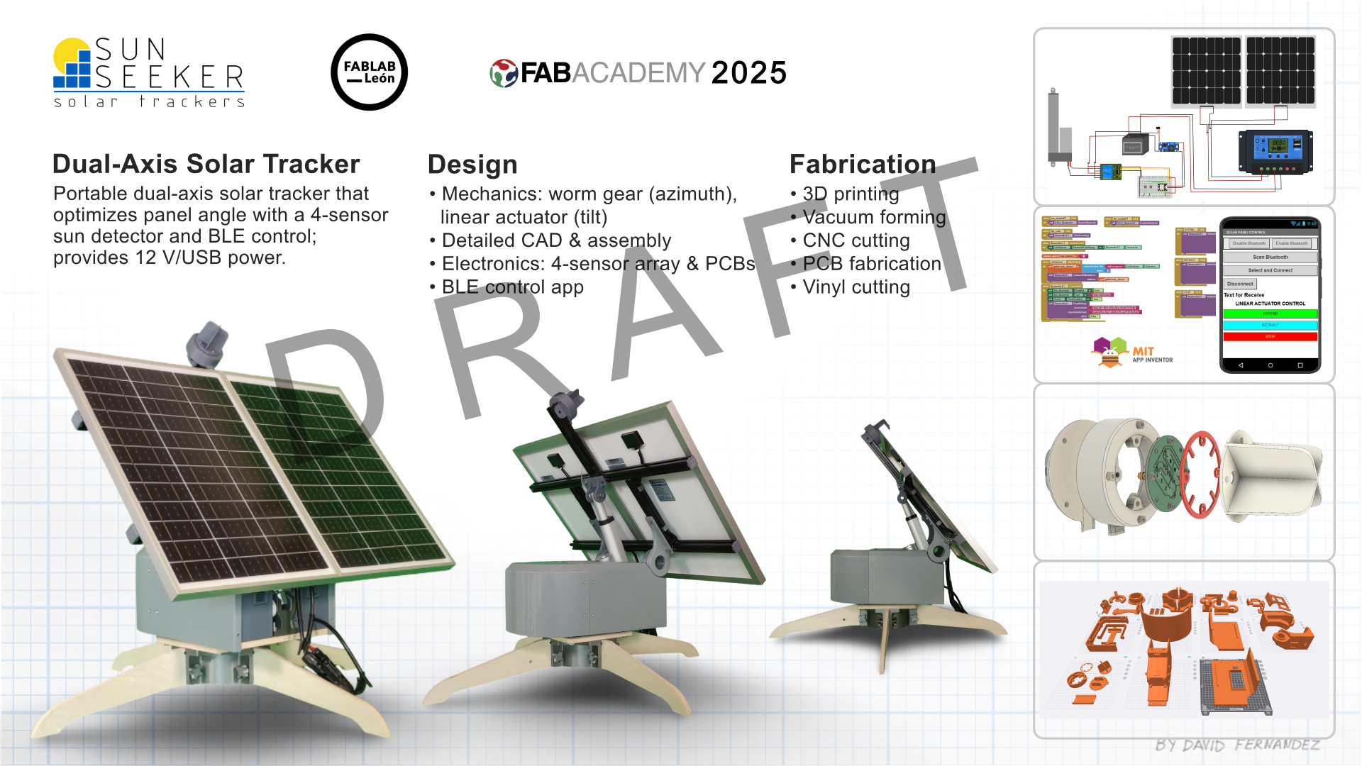 The project is a dual-axis solar tracker: a portable, self-powered dual-axis tracker for small PV panels, with a 4-sensor sun detector, battery storage and BLE app control.