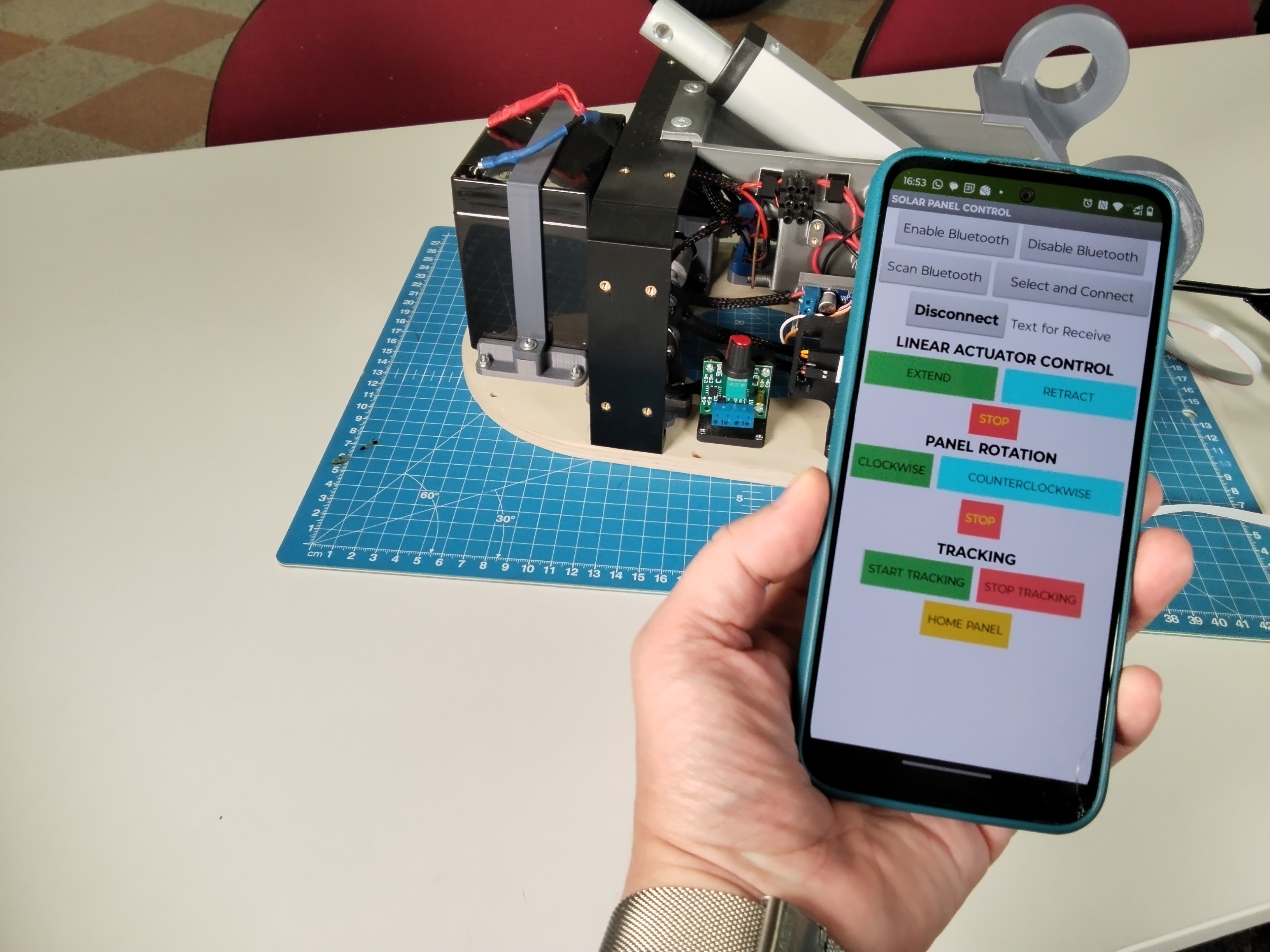 Once connected, the interface provides buttons to control tilt and rotation manually. This allows the user to perform the initial orientation of the panels or to fix the solar panel in a desired position. In addition, the app has a button to start automatic sun tracking, where the panel orientation is updated according to the sensor readings. There are also buttons to stop the automatic tracking and to send the tracker back to its “home” position, with the panel horizontal.