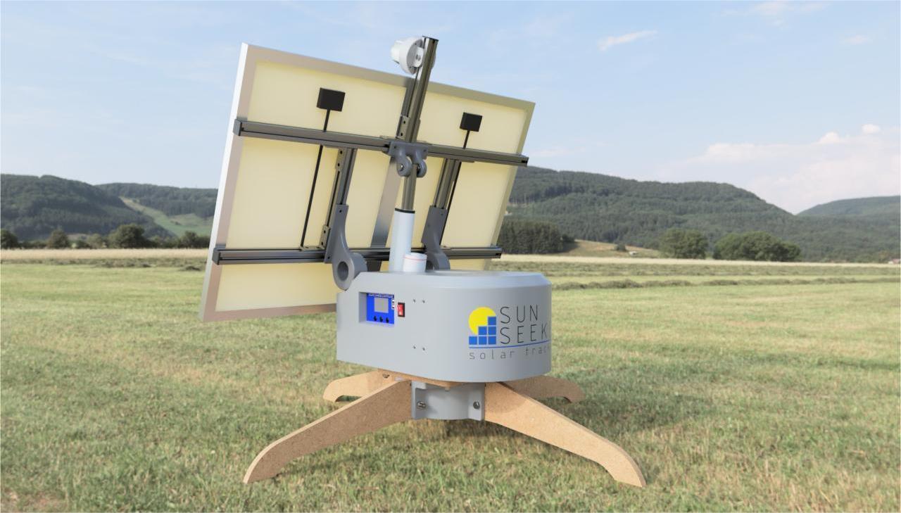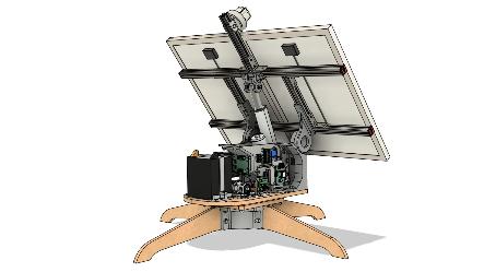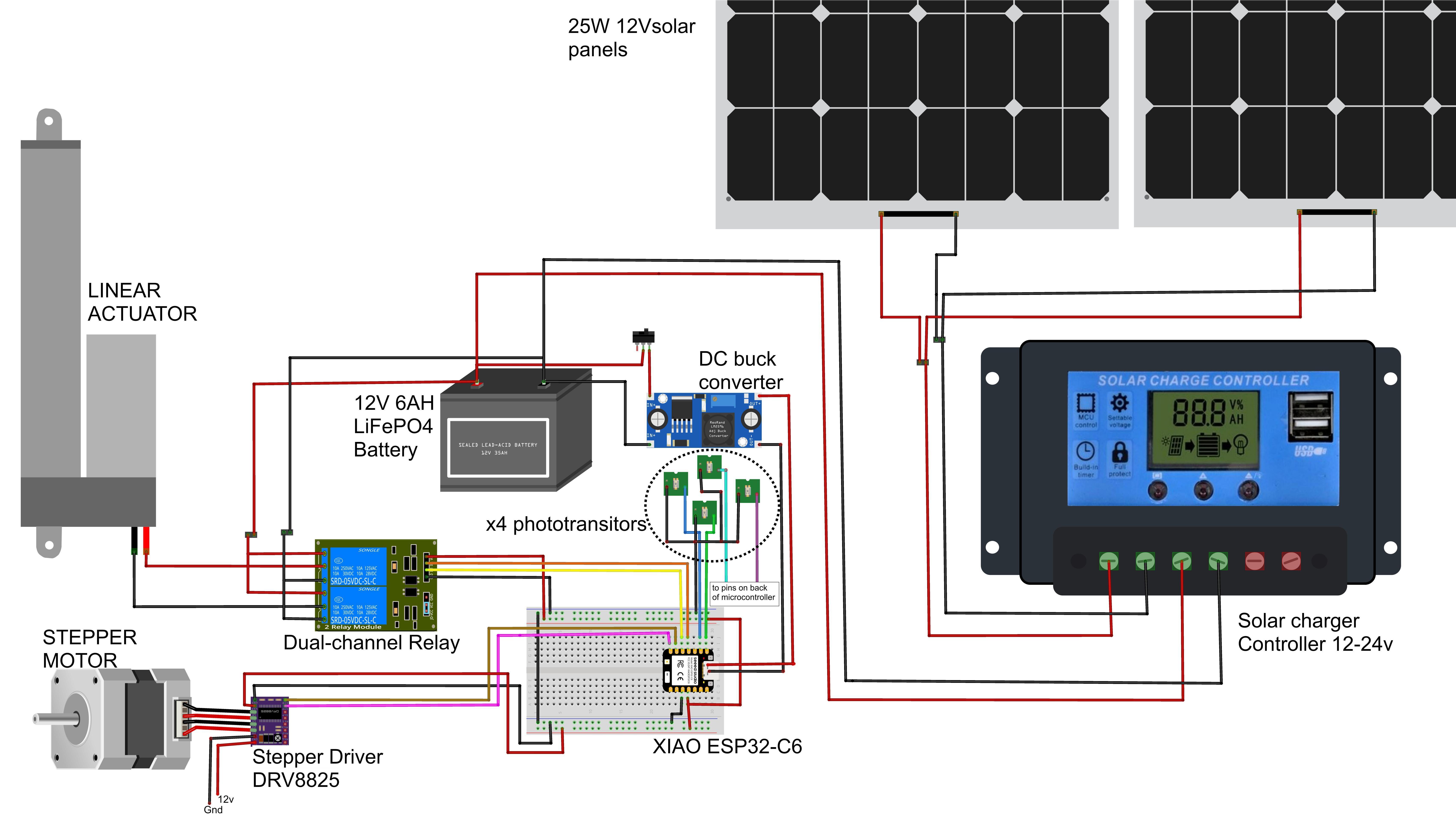 - Actuators and sensors: A stepper motor for azimuth, a linear actuator for tilt, and a phototransistor sensor array for sun tracking.