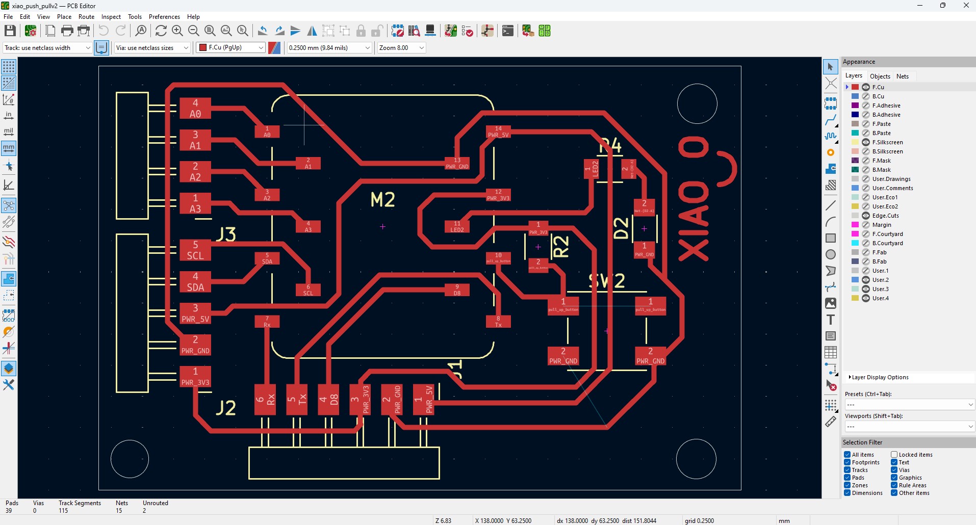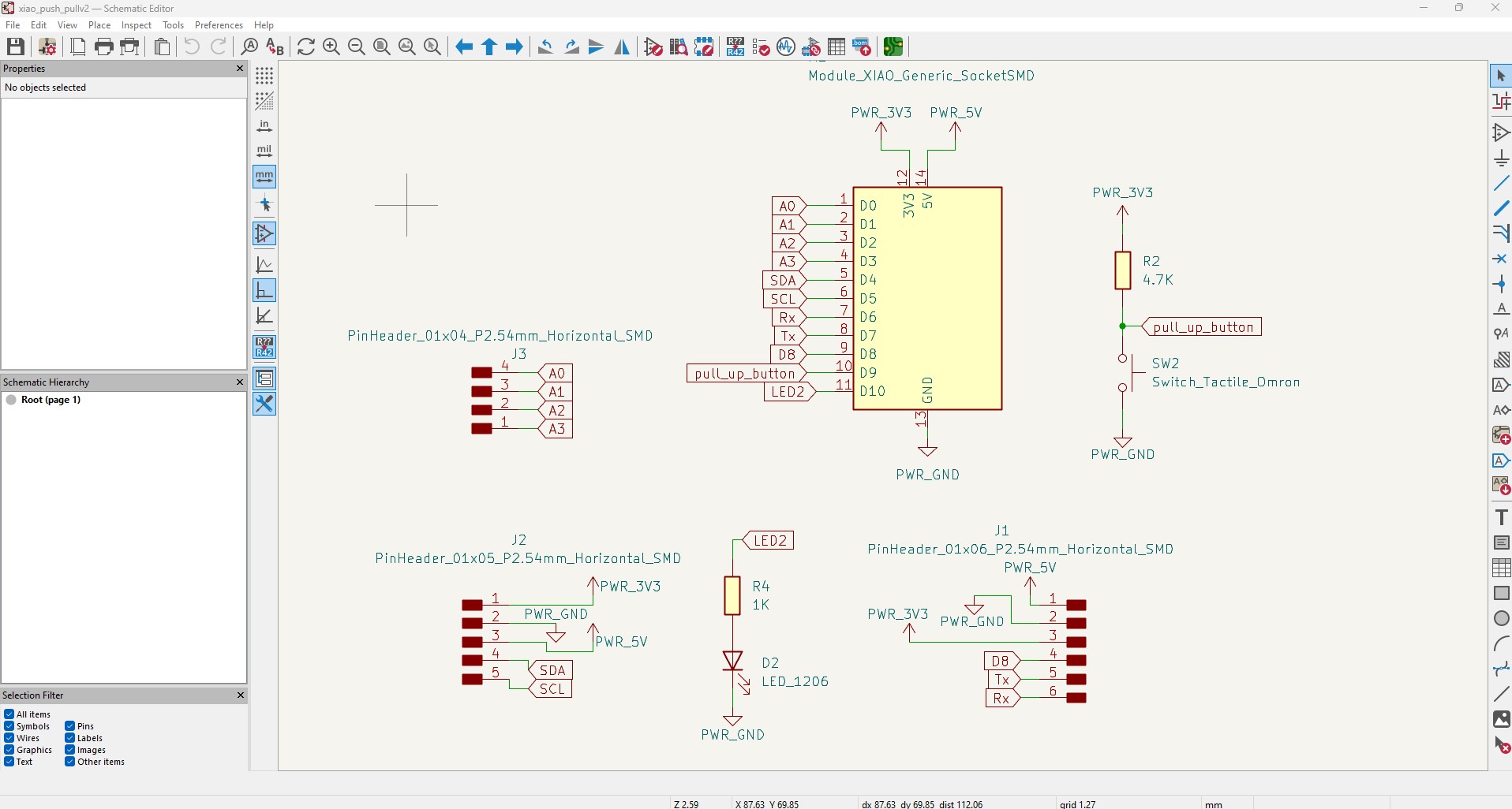 - Power and ground distribution: 5 V and 3.3 V rails routed from the buck converter to the XIAO and to the sensors.