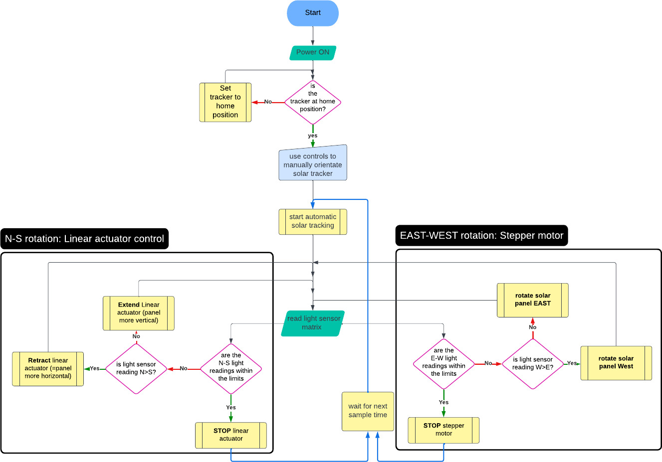 This control strategy moves the panel in small increments until the four sensors are balanced, keeping the panel roughly perpendicular to the sun.