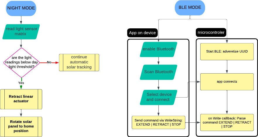 The firmware for the dual-axis solar tracker runs on the Seeed Studio XIAO ESP32-C6 and is organized around three main functions: automatic sun tracking, night mode, and manual control via BLE. The behaviour is described by the flowcharts below.