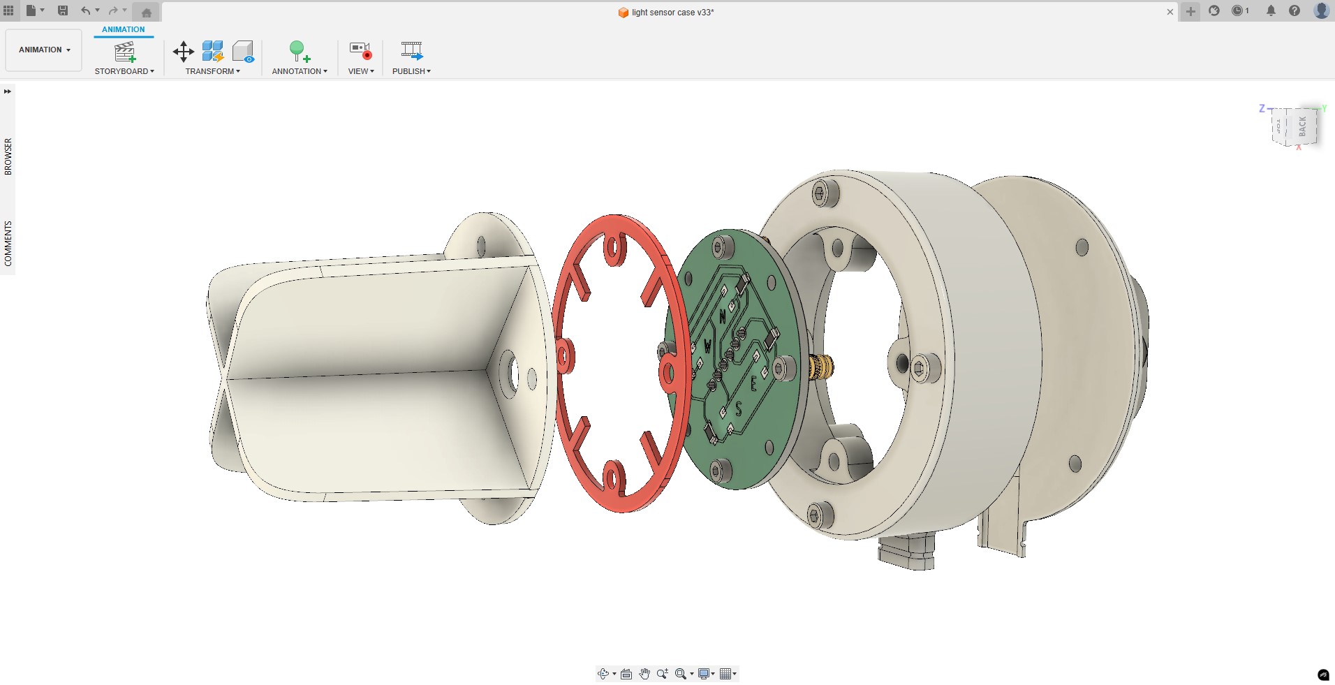 I also designed and fabricated the phototransistor sensor array PCB and its 3D-printed enclosure, which connects back to the microcontroller board through a header and provides the four directional light signals used for automatic tracking.
