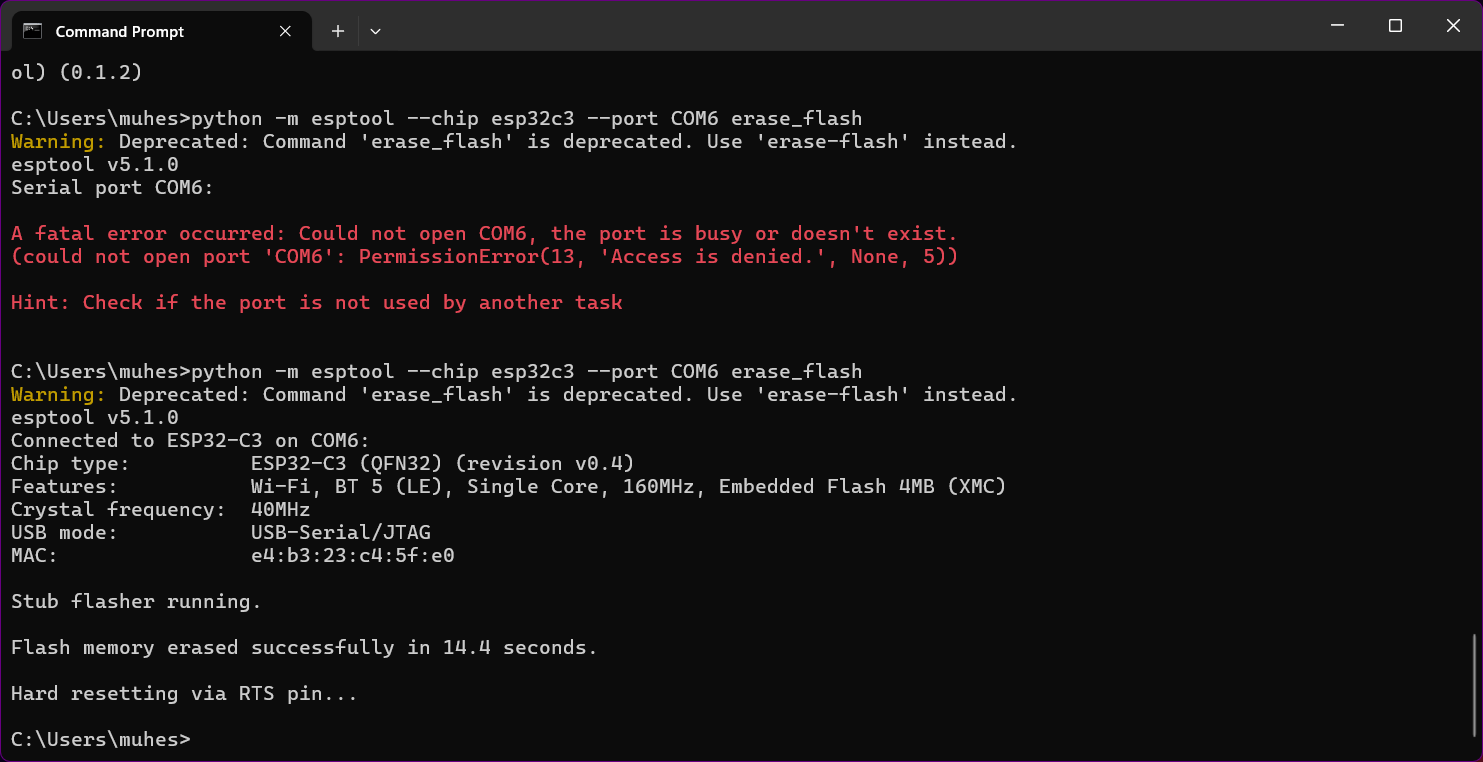 esptool.py --chip esp32c3 --port COMx erase_flash