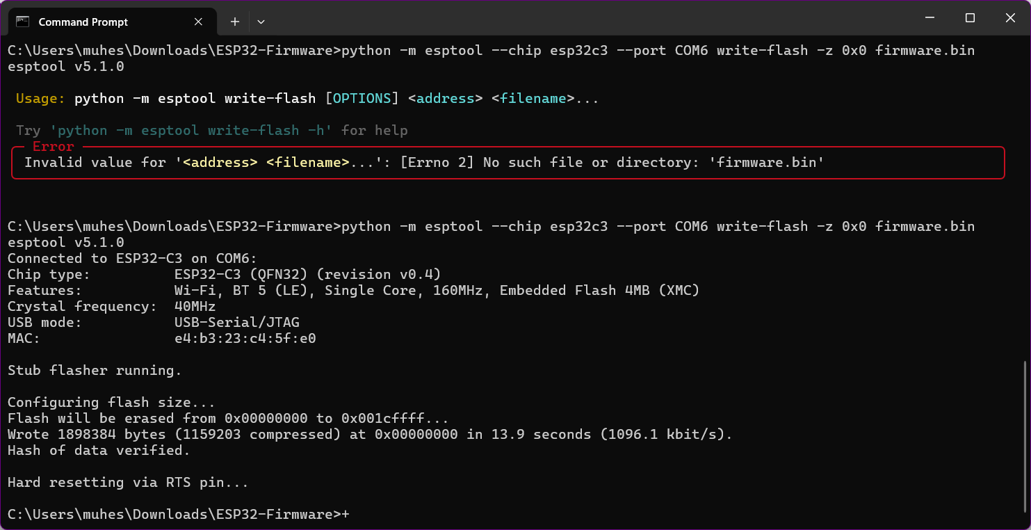 esptool.py --chip esp32c3 --port COMx write_flash -z 0x0 firmware.bin