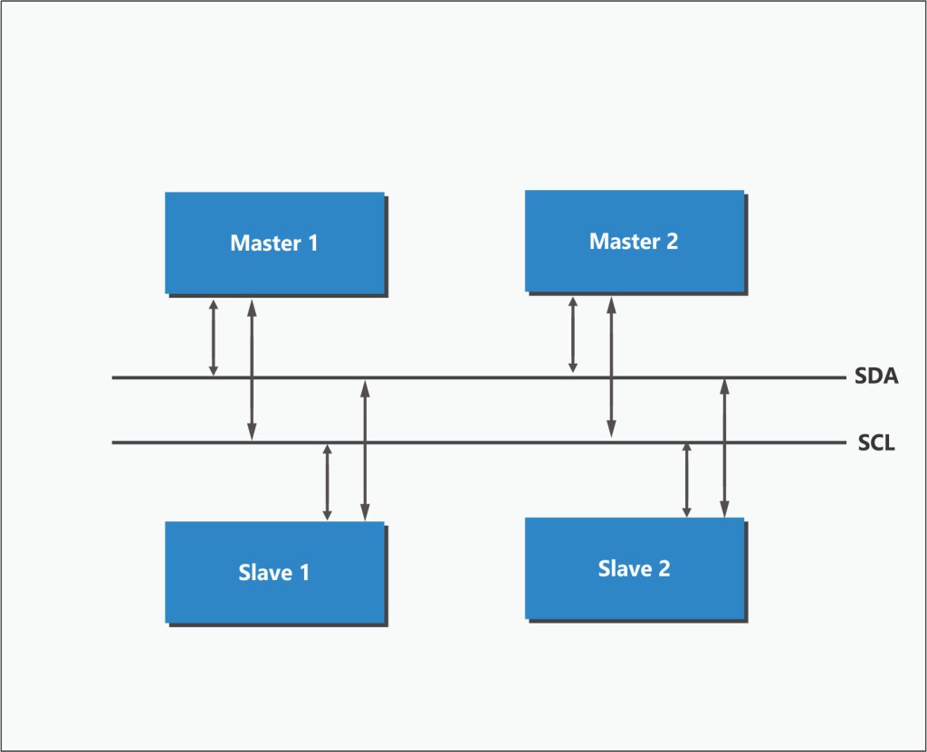- Synchronous, two-wire protocol: SDA (data), SCL (clock).