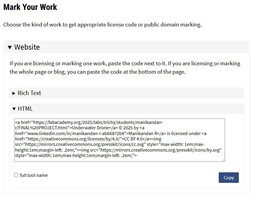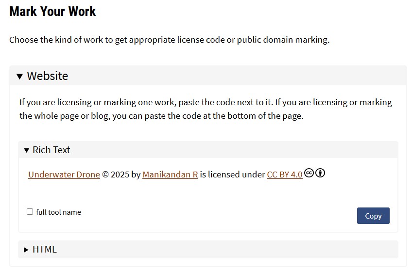 The generated license notice: "Underwater Inspection Drone Β© 2025 by Manikandan R is licensed under CC BY-NC-ND 4.0"