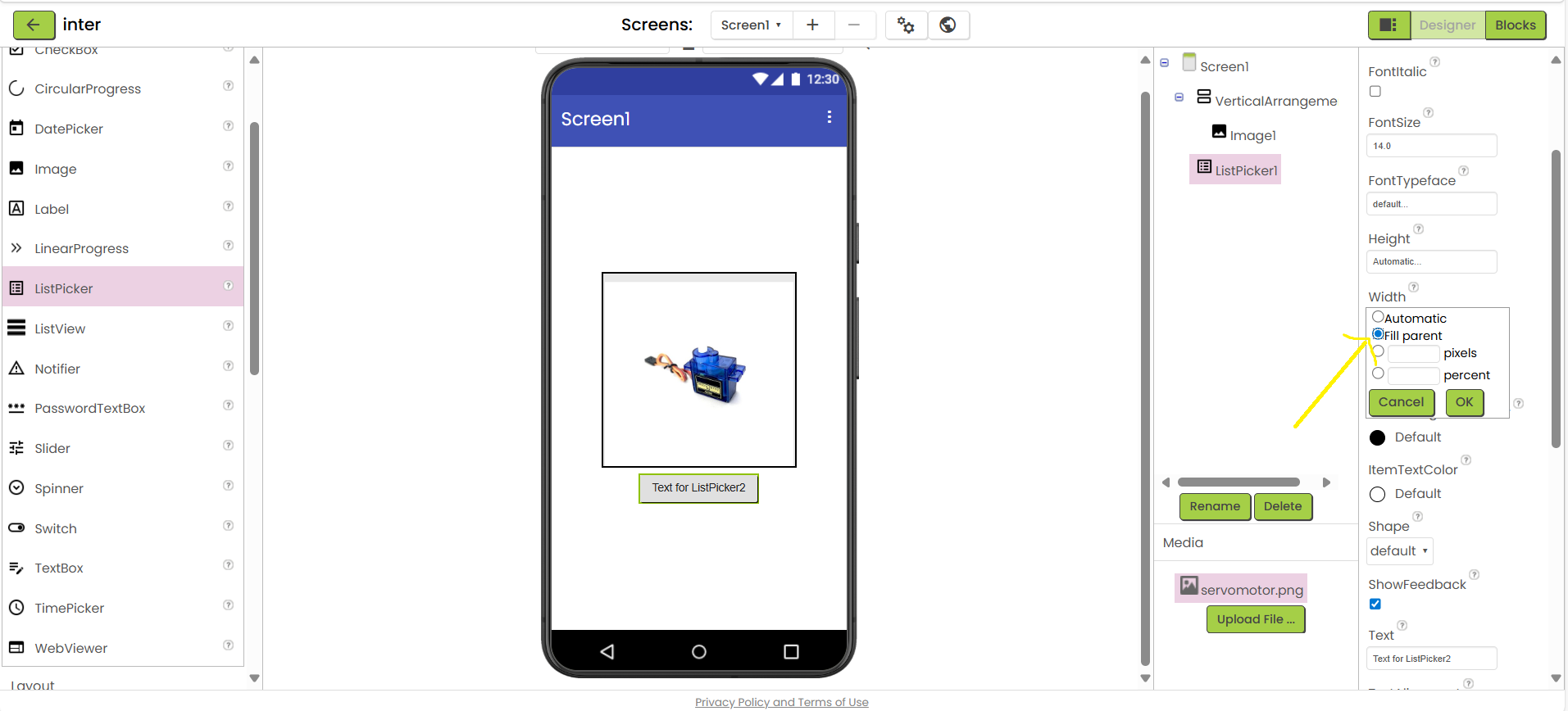 16.Set ListPicker width as fill parent :