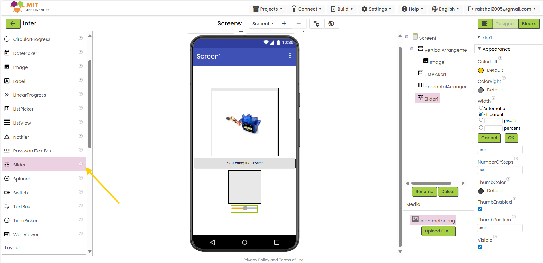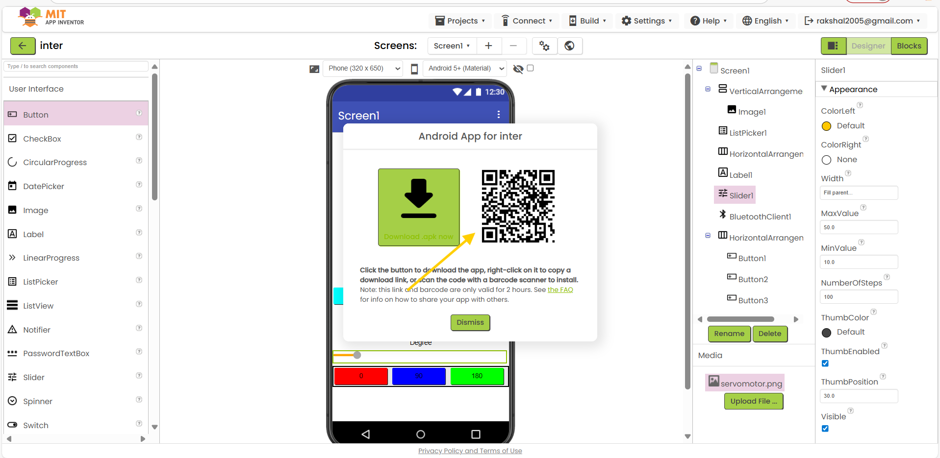 Design: Place a button on the app to control the servo motor.