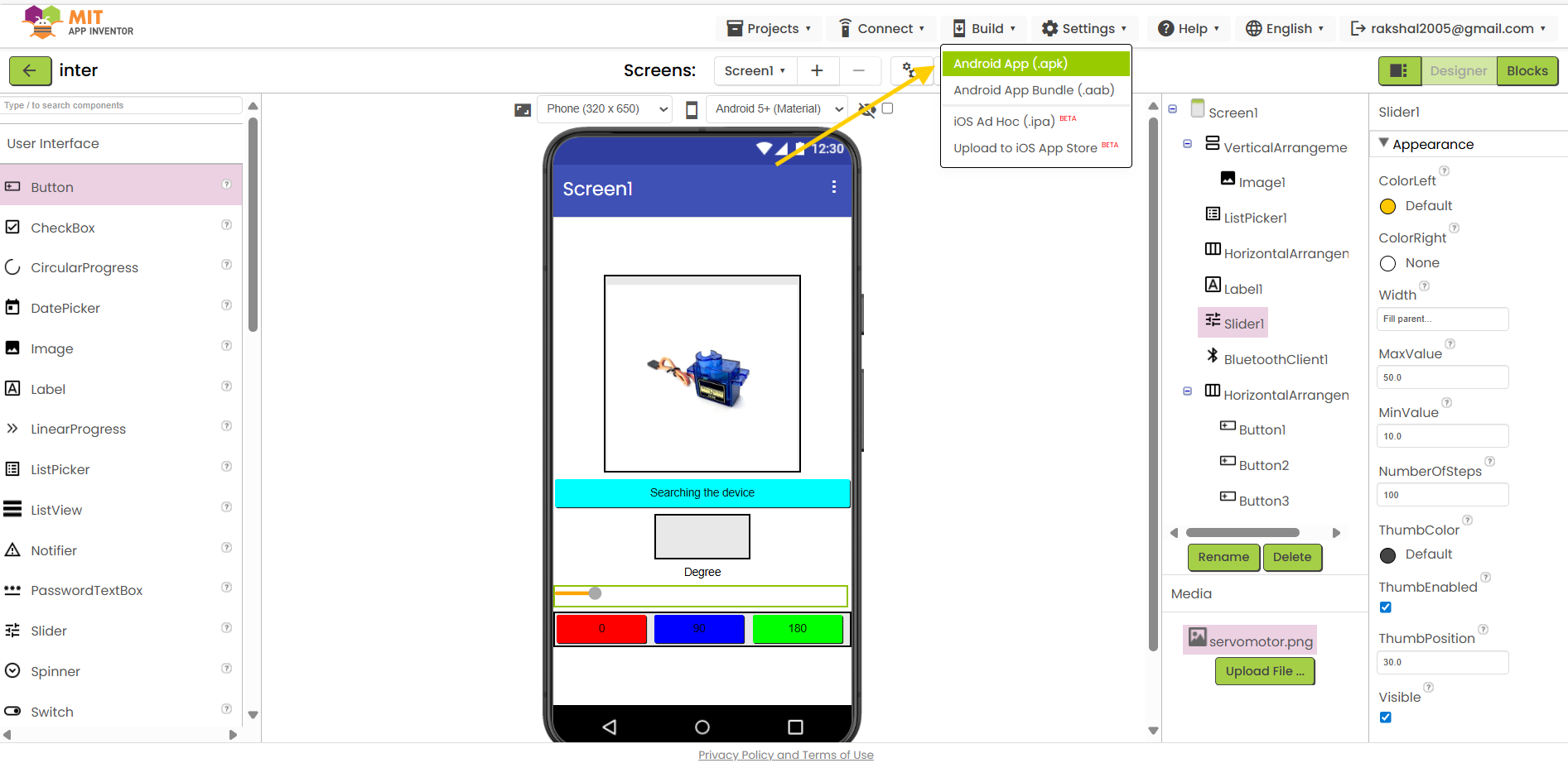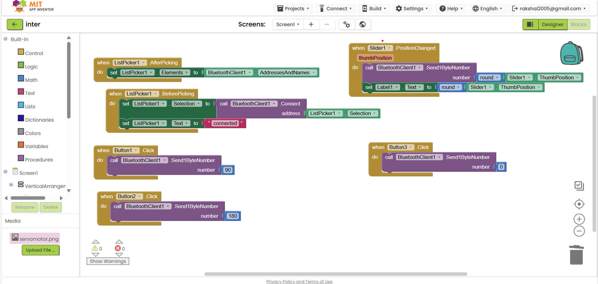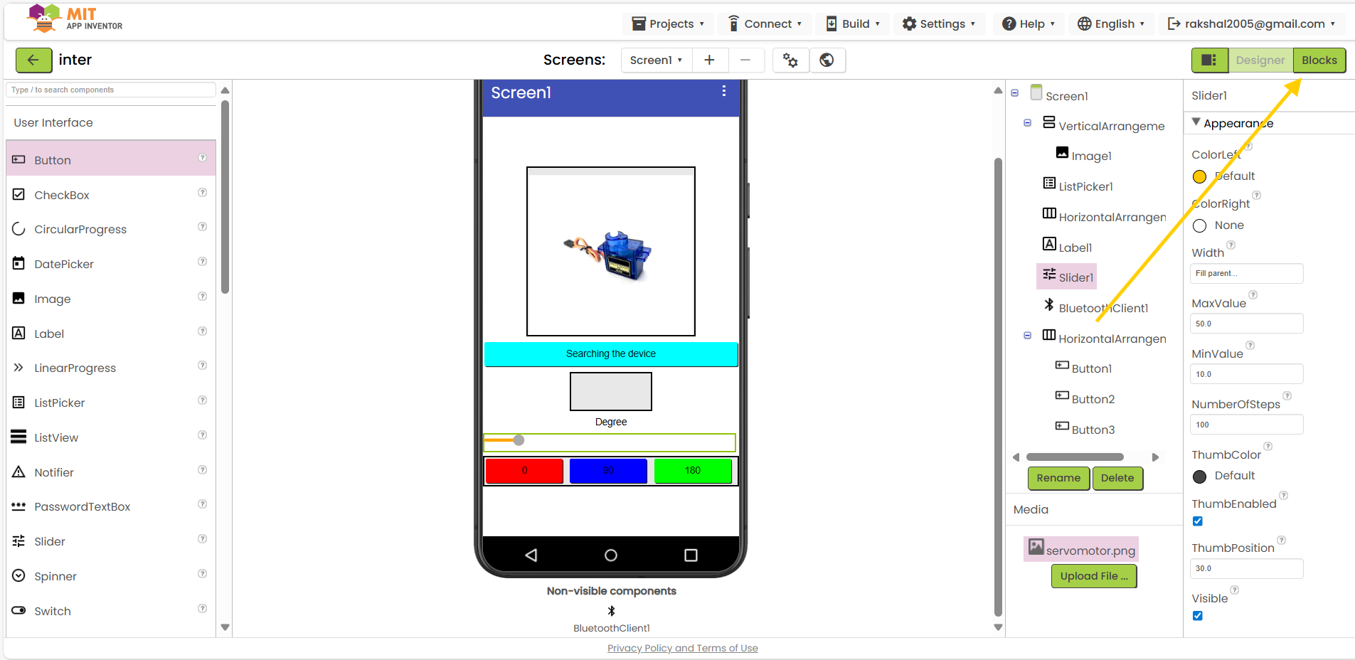 Blocks: When the app launches, create blocks to connect to the Bluetooth module. When the button is pressed, add blocks to transmit an instruction to move the servo.