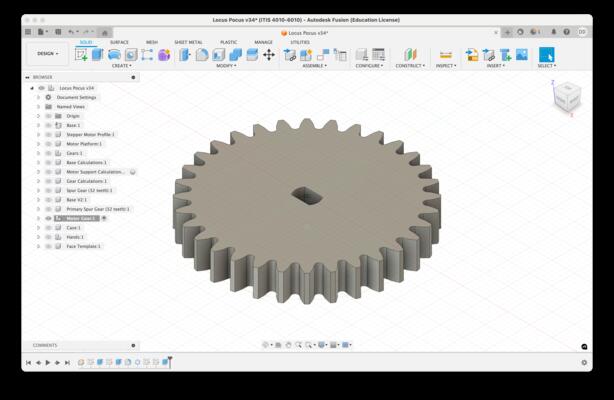 With the gear parameters set, I created a gear design with the Autodesk Fusion spur gear generator. The spur gear generator is an add-in that comes with Fusion, but it needs to be enabled from the add-ins manager. Since the gearing on the clock hand shaft and on the motor would be the same size (1:1 gear ratio), I created a single primary gear component design as a base component that was copied for use in clock hand shaft design and motor designs.